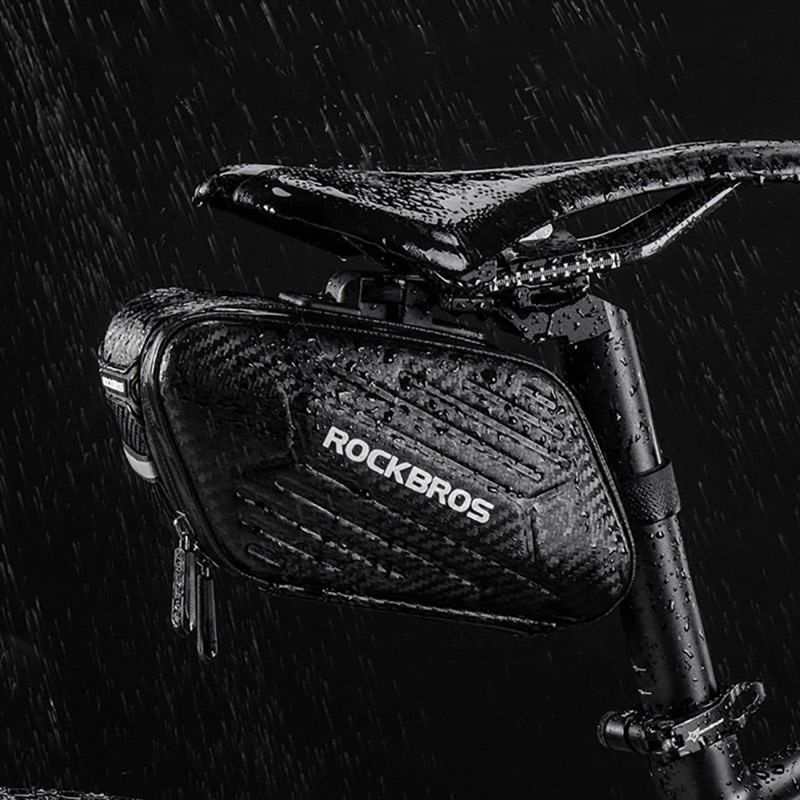 The Rockbros B59 bike bag is a sturdy under-seat bag with a capacity of approximately 1.5 L, designed for convenient storage of essentials while riding. Its rigid, carbon-fiber-textured construction protects its contents and maintains its shape even with heavy use. A large side opening allows for quick access to stored items, while internal pockets help keep things organized. A stable under-seat mounting system ensures secure attachment, while a reflective element and optional light attachment enhance visibility after dark.