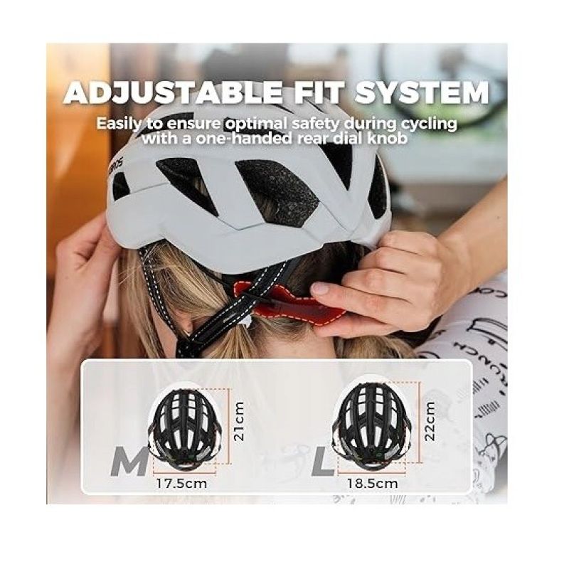 The city helmet weighs only approximately 260g and is very lightweight, eliminating any burden or pressure when worn. The magnetic closure makes it easy to put on and take off the bike helmet. The head circumference can be easily adjusted with one hand using the adjustable button behind the head (size M is 54 to 58 cm, and size L is 58 to 62 cm).