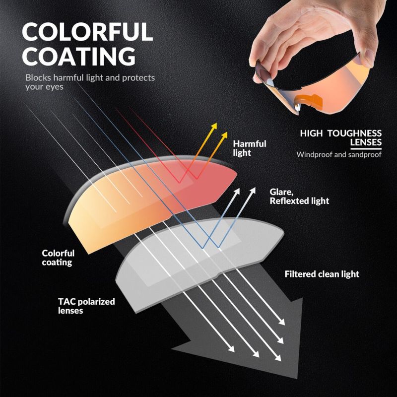 Polarized HD TAC lenses with Category 3 multi-layer coating reduce reflections from surfaces like water and asphalt. They protect eyes from harmful UV radiation, minimizing eye fatigue and improving visibility.