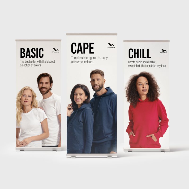ST - Roll-up STAGE in the format 80 x 200 in English., CH - Roll-up CHILL in the format 80 x 200 in English., BE - Roll-up BEANIE in the format 80 x 200 in English., BA - Roll-up BASIC in the format 80 x 200 in English., PO - Roll-up PIQUE POLO in the format 80 x 200 in English., CA - Roll-up CAPE in the format 80 x 200 in English.