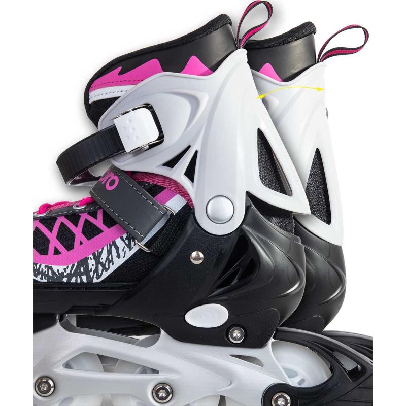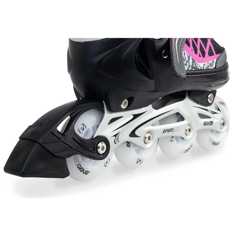 They feature a lightweight and strong aluminum frame, a brake, 64 mm diameter frosted wheels with white LED lights , three adjustable mounts, and gradual size adjustment. The wheels and ABEC7 bearings reduce rolling resistance and are suitable for long distances and recreational skating. A reinforced upper with a waterproof coating , a wide, comfortable fit, and soft padding around the ankle significantly enhance comfort while skating. The skating frames are made of durable metal that is resistant to damage and rust.