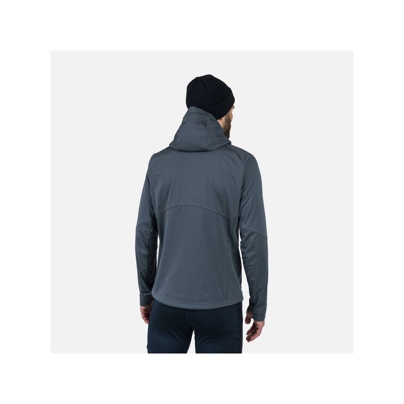 The Rossignol Genetys men's hooded jacket is designed as a lightweight and breathable layer ideal for Nordic skiing, hiking, and ski touring. Made of a stretchy softshell material, it provides effective protection against wind and harsh weather. A stretch panel on the back enhances breathability, aids temperature regulation, and guarantees complete freedom of movement with every stride. A soft fleece lining and adjustable hood offer additional warmth, while functional zippered side and wrist pockets hold essentials like a ski pass, keys, or documents.