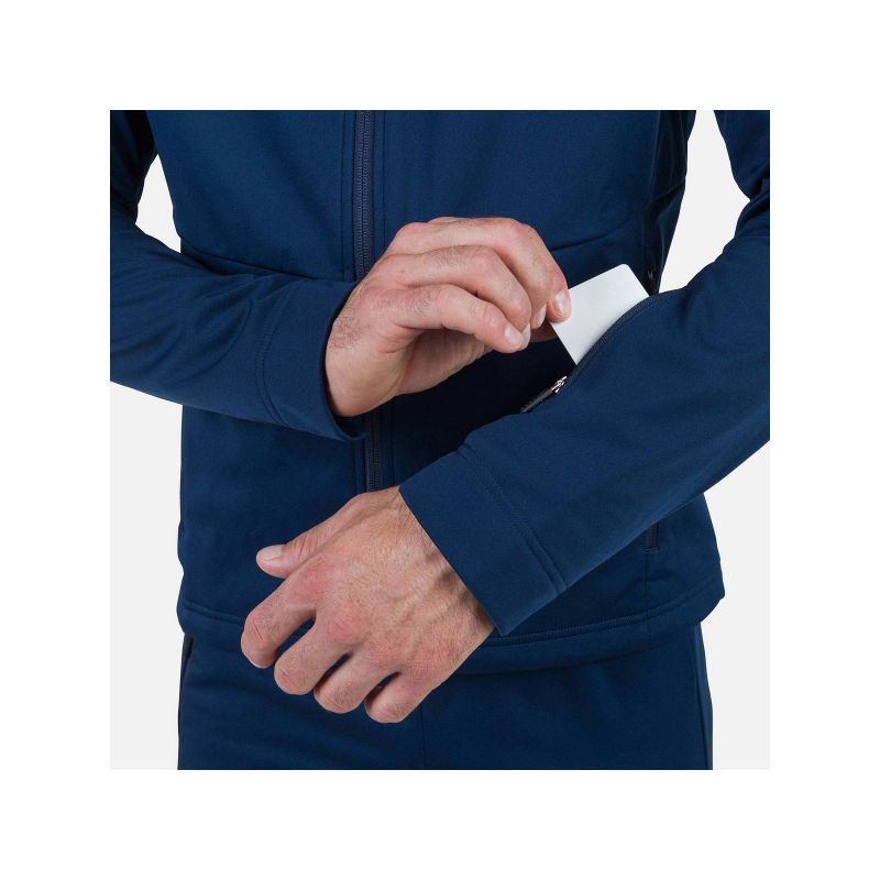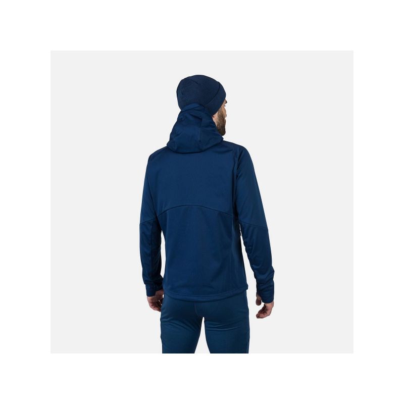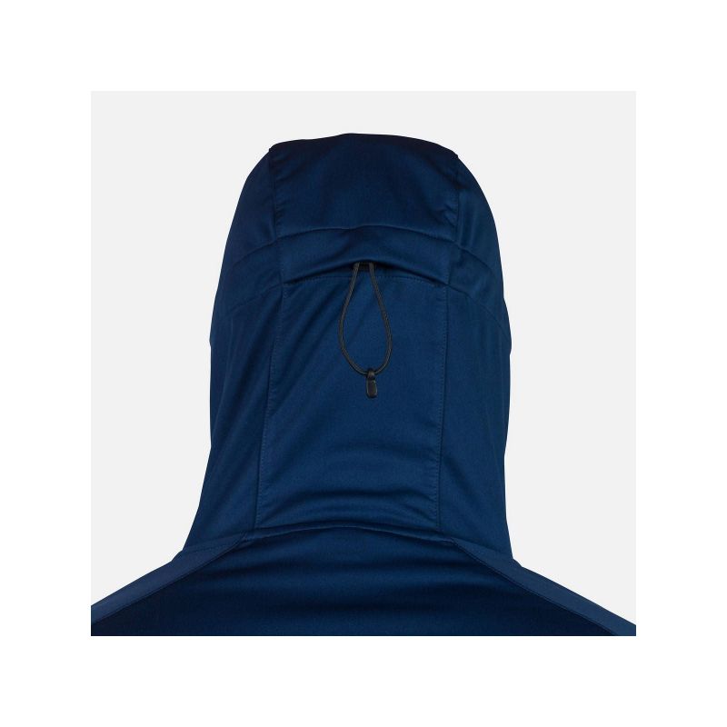 The Rossignol Genetys men's hooded jacket is designed as a lightweight and breathable layer ideal for Nordic skiing, hiking, and ski touring. Made of a stretchy softshell material, it provides effective protection against wind and harsh weather. A stretch panel on the back enhances breathability, aids temperature regulation, and guarantees complete freedom of movement with every stride. A soft fleece lining and adjustable hood offer additional warmth, while functional zippered side and wrist pockets hold essentials like a ski pass, keys, or documents.