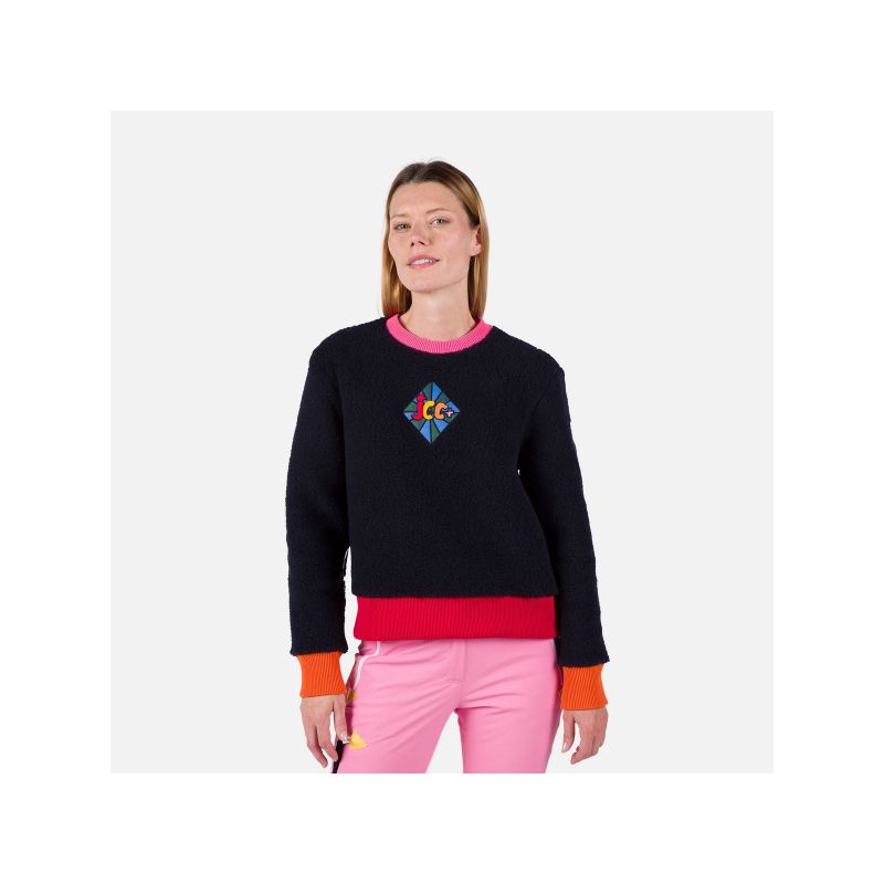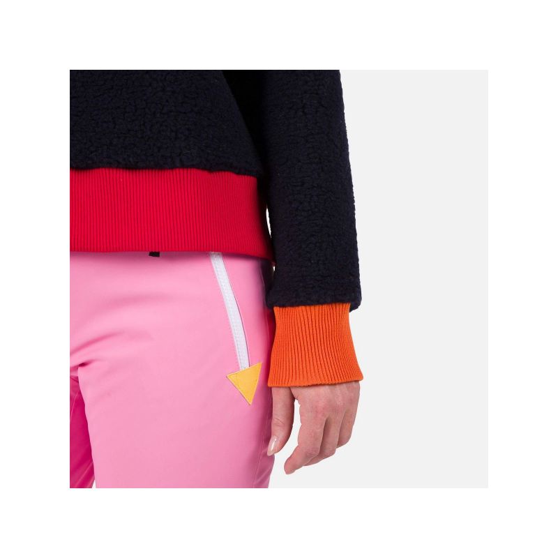 The Rossignol W Lumy Fleece Sweat for women combines chic and comfort, offering a unique style for cold days. Created in collaboration with Jean-Charles de Castelbajac, this sweatshirt features bold, colorful details that add energy to any outfit. The soft, plush teddy fleece with a wool blend provides a luxurious feel and warmth, perfect for winter days.