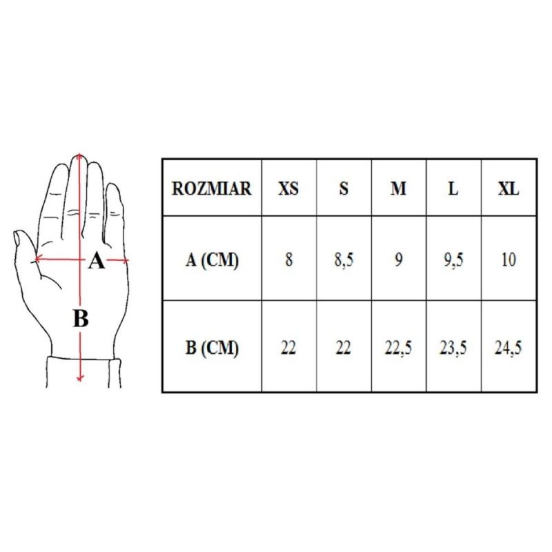 The gloves are available in sizes XS, S, M, L, XL. Below is a table that will help you choose the right size.
