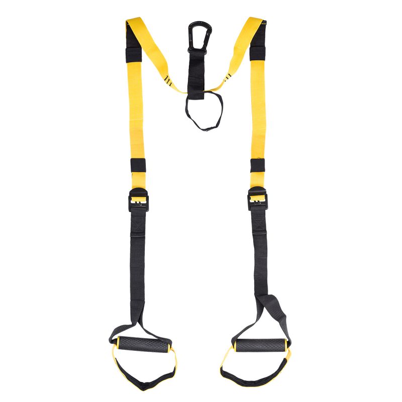 The set includes training bands with handles and a metal carabiner, a door holder, and a net. The handles are covered with foam to prevent slippage during exercise.
