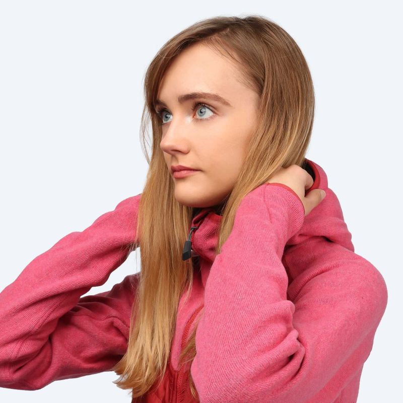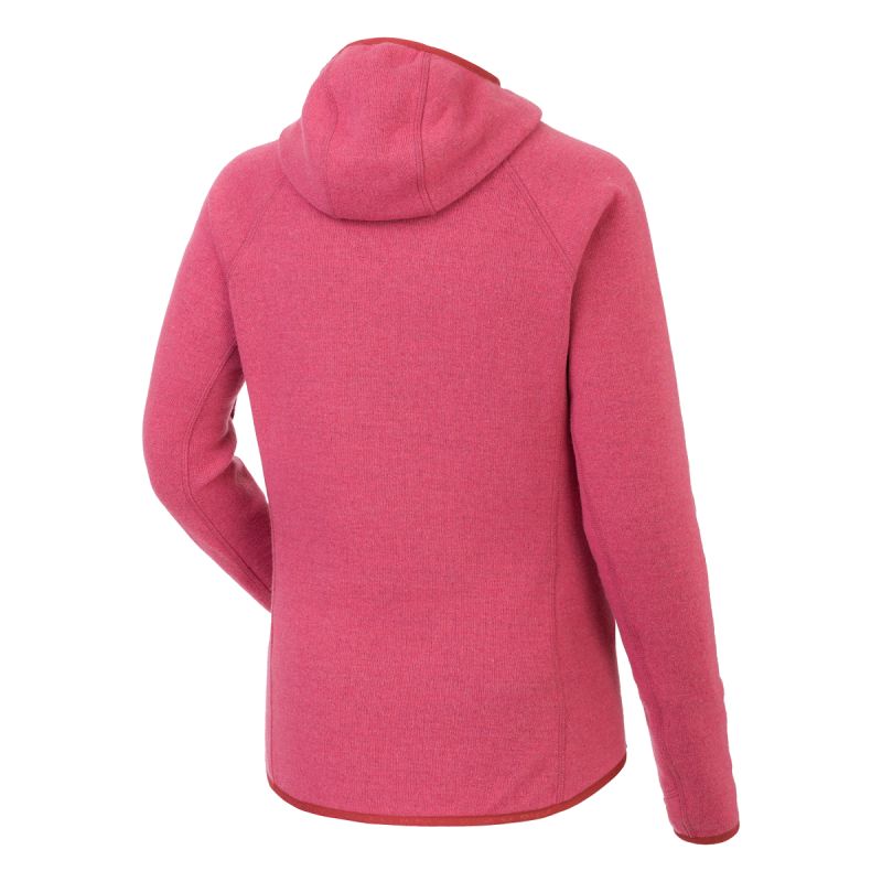 Women's fleece and wool hooded sweatshirt for mountain and travel use.