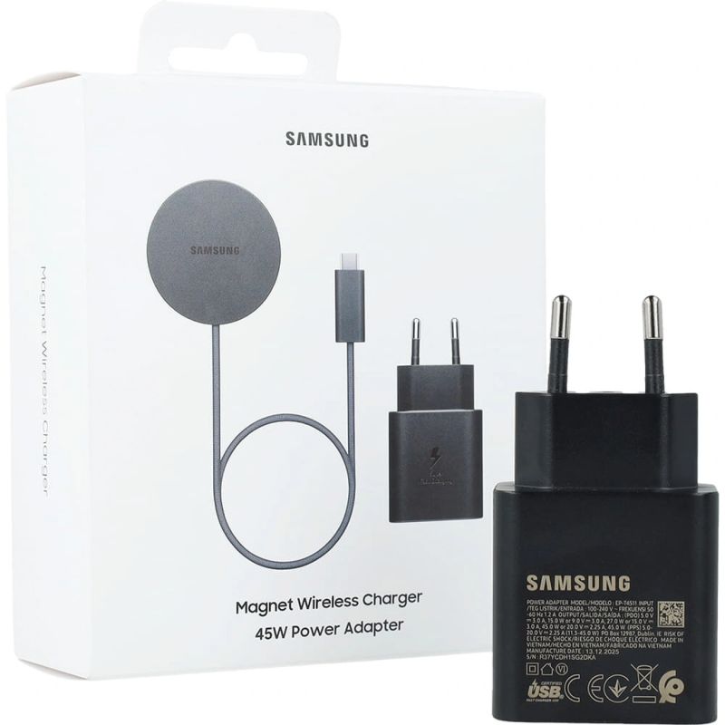 The Samsung EP-P2900TBE wireless charger enables convenient and fast wireless charging thanks to magnetic fit technology. Qi2 certification allows for charging at up to 25W with compatible devices, ensuring efficient charging. The power can be increased to 45W using the included adapter. The slim, 4.4mm thick design and 1.5m cable enhance the convenience of using your smartphone while charging. The non-slip surface stabilizes the device on the charger, while precision magnets help position the phone in the optimal position. This practical solution is suitable for everyday charging of smartphones and Galaxy Buds earphones.