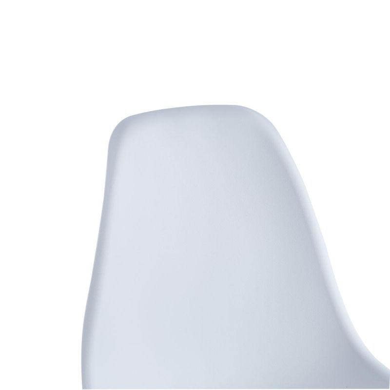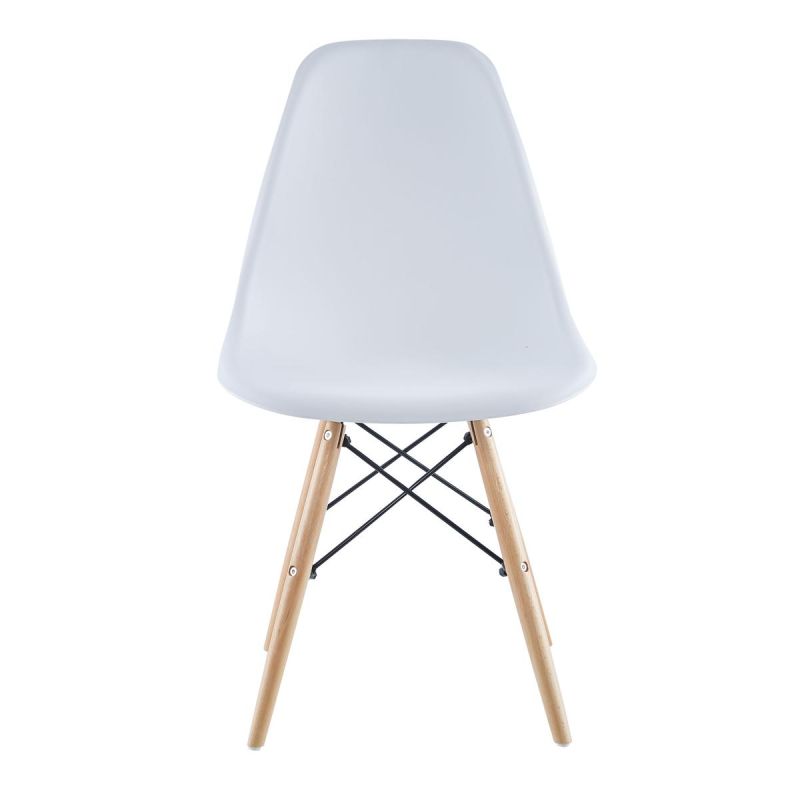 The streamlined shape of the seat gives it a delicate and soft feel. Its contoured design ensures comfortable seating. The matte-finish plastic ensures adequate durability. Four wooden legs with extended metal rods give the chair a slightly industrial character.