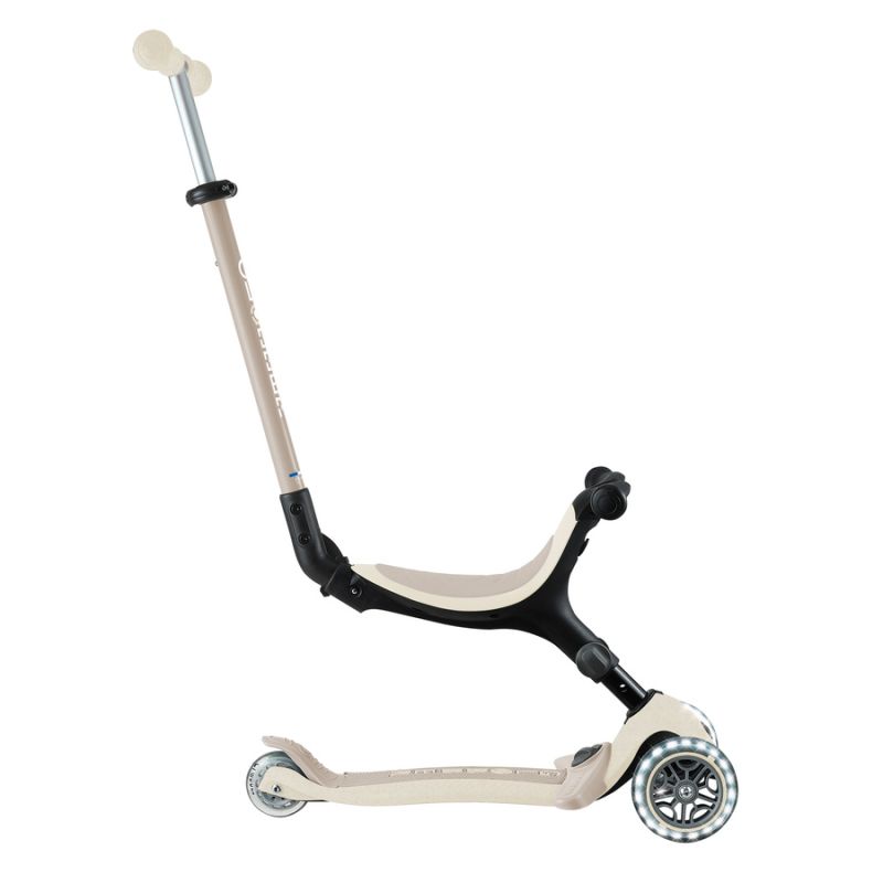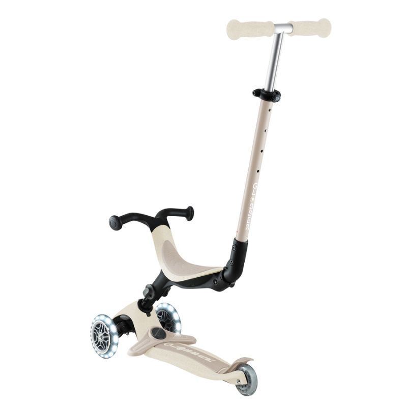This 3-wheeled, light-up eco-scooter with seat grows with your child: it functions as a ride-on (15-36 mos.) , a balance bike (15-36 mos.) , and a kick scooter (3-9+ years) . It retains the durability of the iconic original while using more eco-friendly materials for a smaller environmental footprint.
