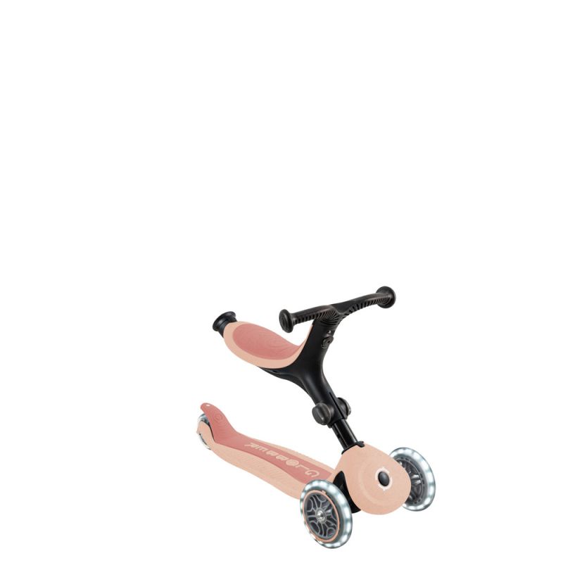 An eco-friendly all-in-one scooter with a seat for small children, made from 100% recycled plastic and organic wheat straw*, and equipped with light-up wheels.