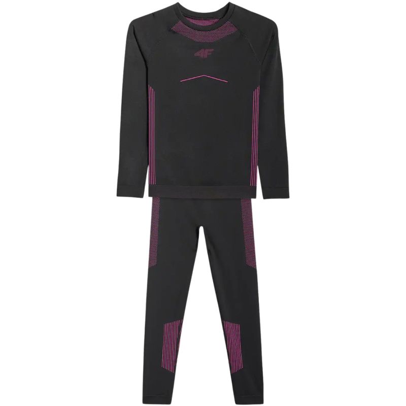 4F F250 Seamless Underwear for Girls, Deep Black 4FJWAW25USEAF250 20S 4F underwear for girls provides high thermal insulation properties and thermal comfort both during long hours spent on the slopes and your favorite everyday activities on cold days. Technical data: Main material: 63% polyester, 32% polyamide, 5% elastane Cut: compression that fits tightly to the body Standard cut of the T-shirt reaching to the hips Raglan sleeves Mid-rise leggings with long legs Made of synthetic material that ensures durability and is easy to care for Seamless construction, perfect as a first layer Thermoactive - maintains optimal body temperature Quick-drying finish - moisture wicking and freshness Round neckline 4FSkin technology ensures a perfect fit and freedom of movement Set: top + bottom