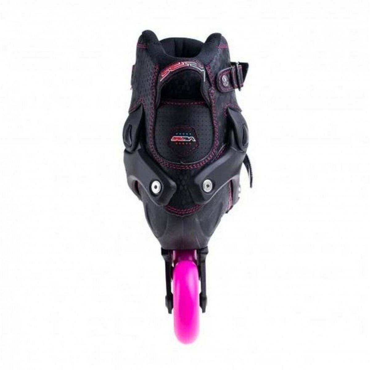 Fasteners: The laces secure the foot perfectly and allow the skates to be tied all the way to the top of the shaft. As befits a slalom model, the shoe features additional Velcro at the toe, improving foot retention in the forefoot. A micrometric buckle eliminates any remaining play after lacing and further stiffens the skate in the heel area.
