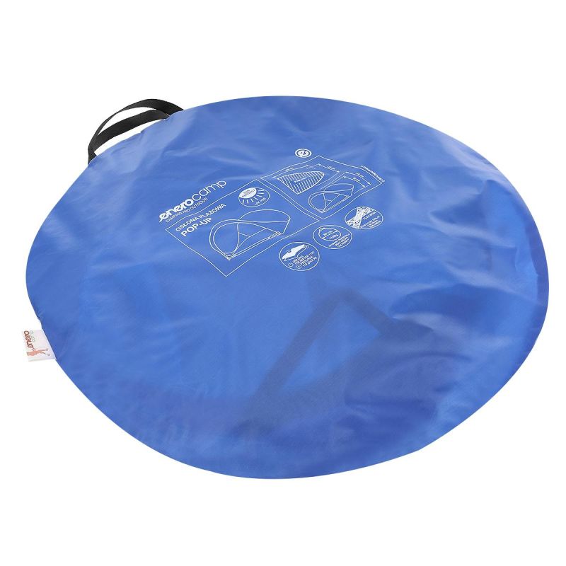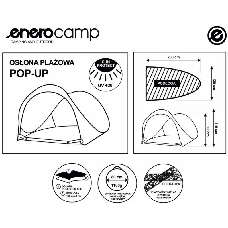 The ENERO CAMP SELF-PUTTING, CLOSABLE BEACH SCREEN TENT 200x120x110/90CM is perfect for all your trips to the seaside, lakeside, or camping. This self-pitching tent from ENERO CAMP is a high-quality product, measuring 120 cm wide, 200 cm deep, and a maximum height of 110 cm, and packed in a convenient carry bag for easy transport and storage. Its fiberglass frame is lightweight and resistant to mechanical damage. The cover is made of strong 170T polyester, which protects against harmful UV radiation and wind, and the additional closure allows you to secure your personal belongings or easily change from wet clothes to dry ones.