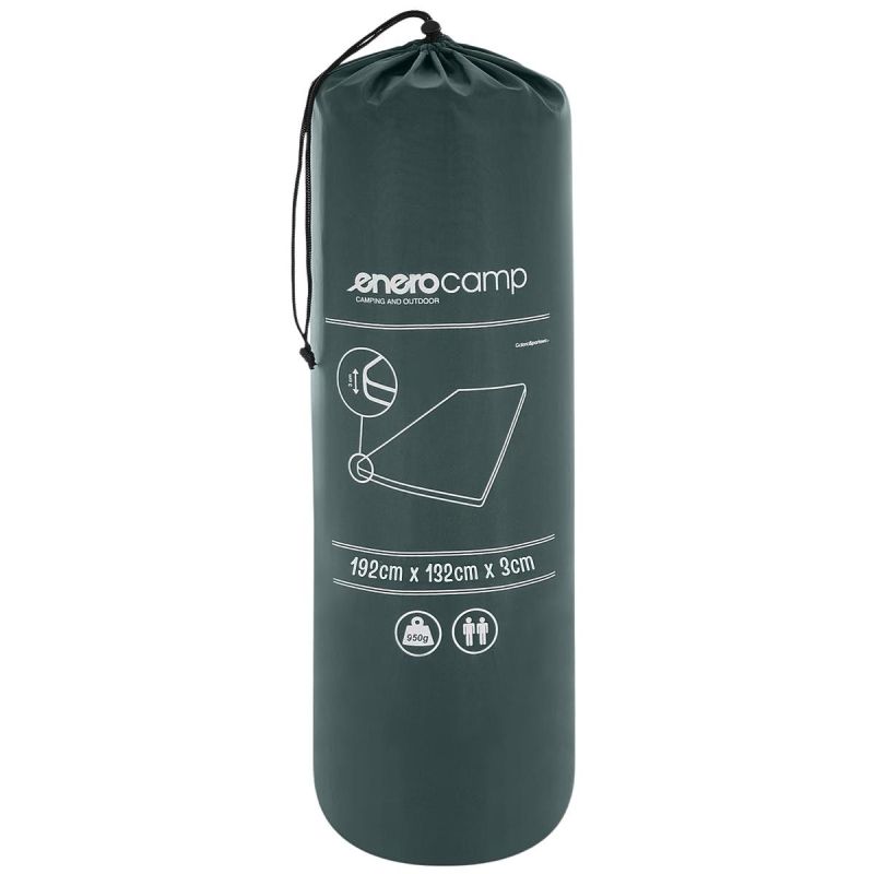 The ENERO CAMP SELF-INFLATABLE MAT 192X132X3CM GREEN is a practical solution for those who value comfort while sleeping outdoors. Its large sleeping surface and ground insulation make it ideal for both camping and recreational trips.