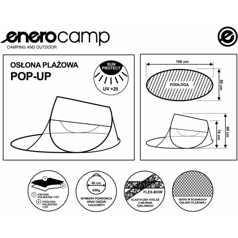The ENERO CAMP SELF-PUTTING BEACH SCREEN TENT 190x80x90/70CM is perfect for all your trips to the seaside, lakeside, or camping. This self-pitching tent from ENERO CAMP is a high-quality product, measuring 80 cm wide, 190 cm deep, and a maximum height of 90 cm, and packed in a convenient carry bag for easy transport and storage. Its fiberglass frame is lightweight and resistant to mechanical damage. The cover is made of strong 170T polyester, which protects against harmful UV radiation and wind. Numerous mesh inserts are placed on the sides, ensuring excellent ventilation inside.