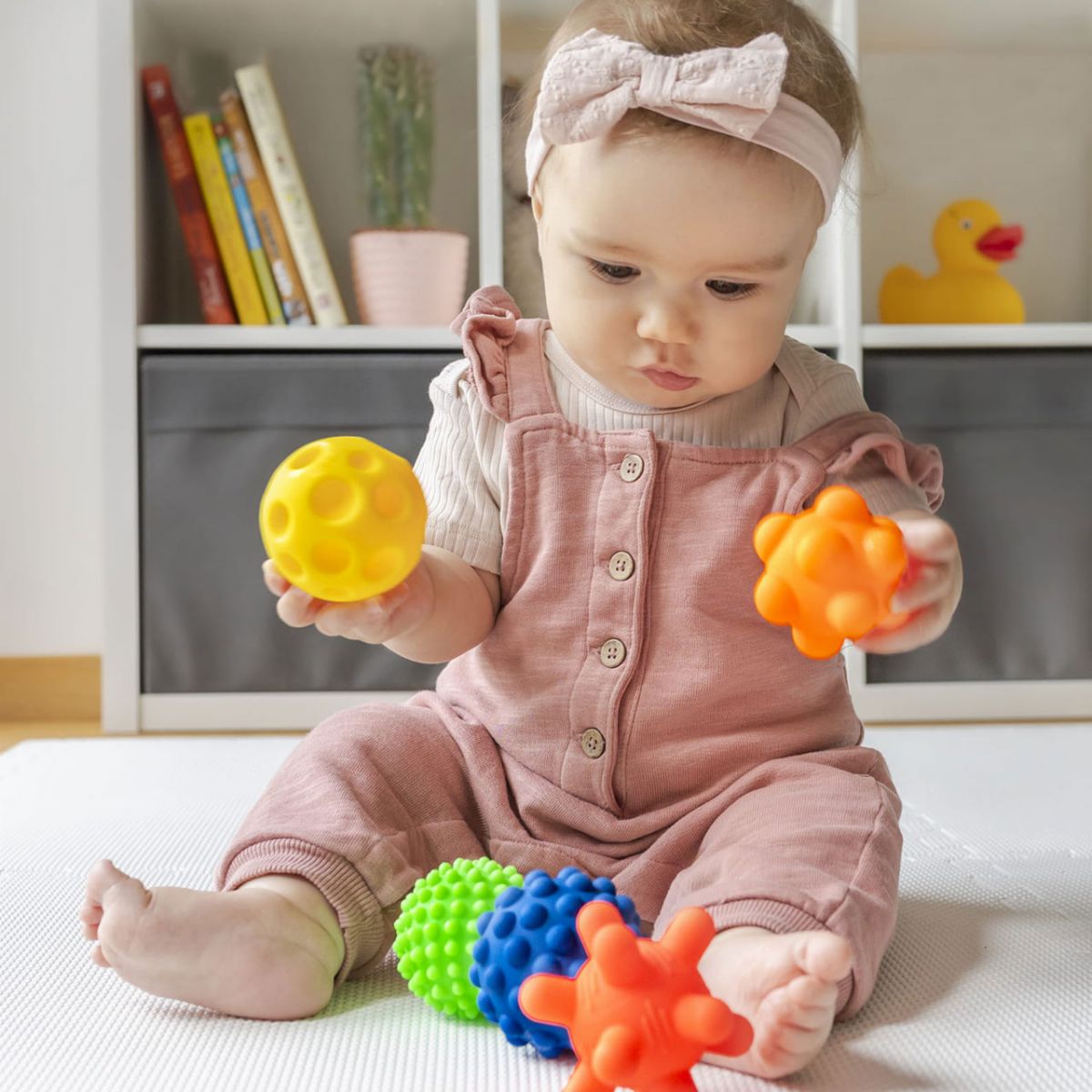 - A set of balls with different textures and shapes suitable for throwing, rolling, squeezing and biting during the teething period.