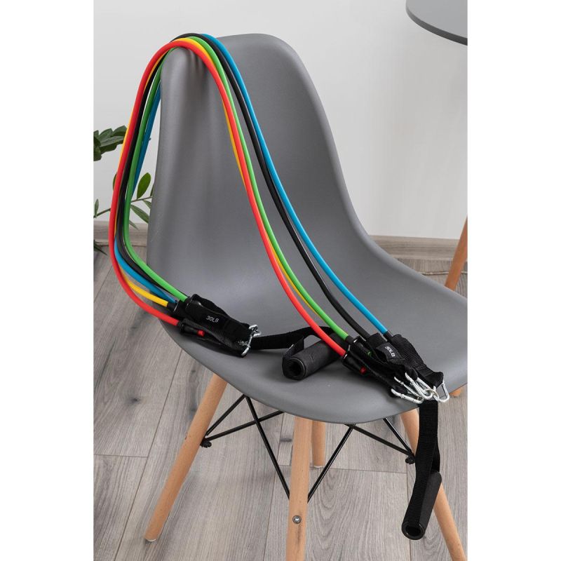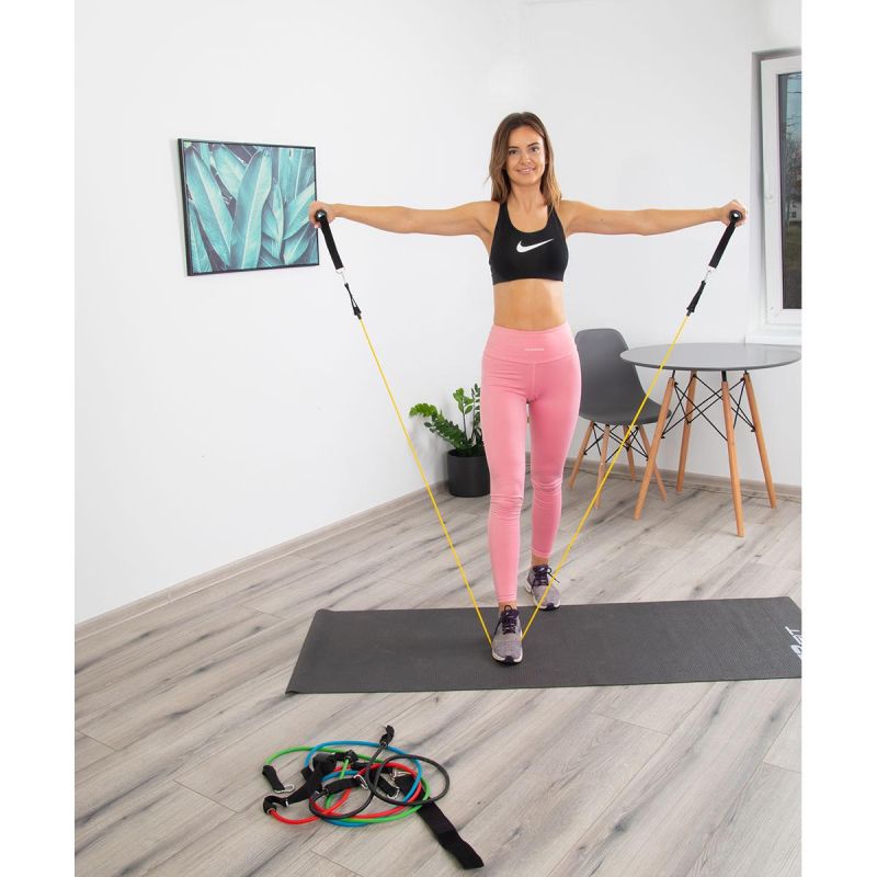 This set of 5 bands is a functional, handy tool that allows you to perform exercises that develop the muscles of the lower and upper body. These workouts will shape your arms, chest, and back. Two ankle straps strengthen your ankles and knees. The device consists of five bands made of TPE material. Depending on your needs, you can add or remove the cords, thus adjusting the resistance level. Comfortable foam handles fit comfortably in your hand and won't slip during exercise. Strong metal hooks ensure stability and safety during exercise.
