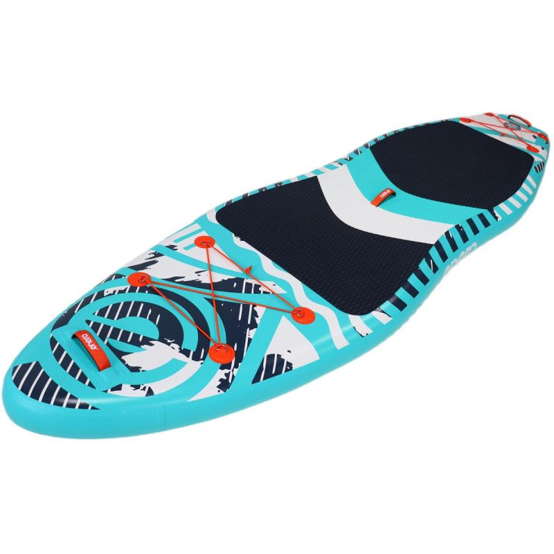 The board has been equipped with additional accessories. A high-pressure pump with a gauge allows you to inflate the board, and a repair kit allows you to repair any damage. Strong, crisscrossed rubber straps on the front and back of the board allow you to carry a small backpack, for example, while a backpack-style bag makes transporting and storing the kit easier.