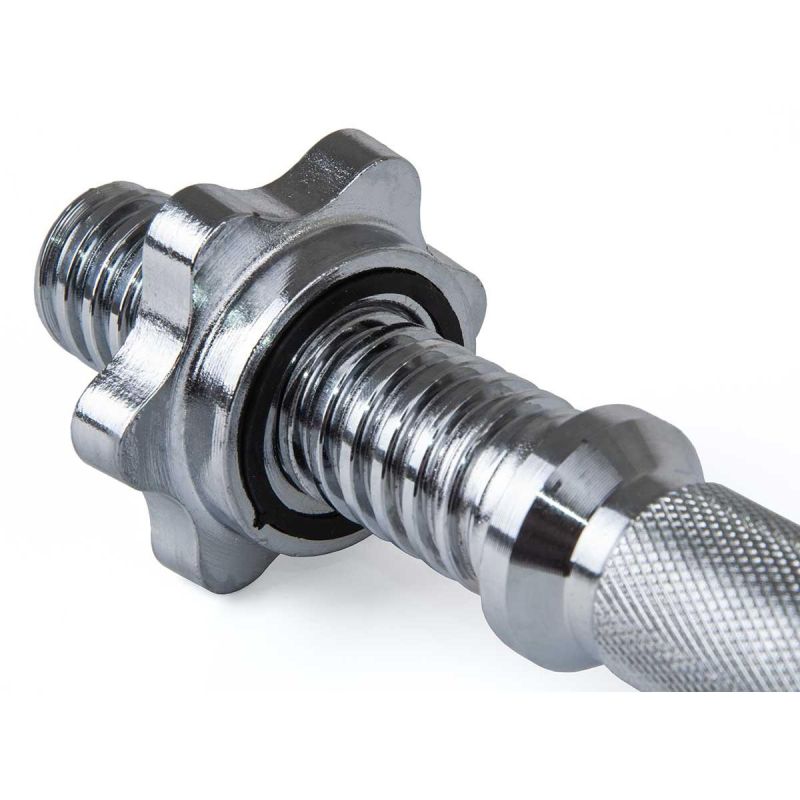 The non-slip (grooved) grip section with special notches increases your safety and ensures a secure and comfortable grip, minimizing the risk of the barbell slipping out of your hand . Threaded clamps keep the plates precisely pressed throughout your workout. This ensures even load distribution and a more effective workout.