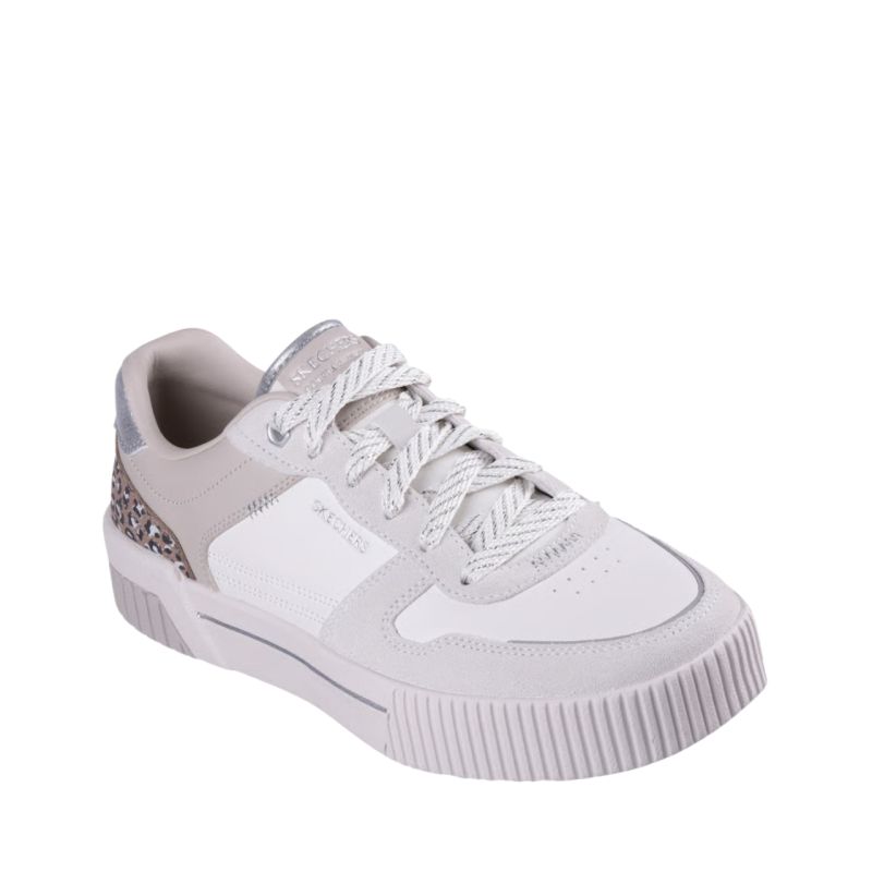 Skechers Jade Lustrouse Luxury Women's Shoes White 185390 WMLT. These women's low-top Skechers shoes combine comfort and style for everyday wear. A synthetic leather and suede upper provides a comfortable fit and durability. A Skechers Air-Cooled Memory Foam footbed cushions your steps and adds comfort, while a rubber cupsole provides traction and flexibility. The model features a 3.2 cm heel and features leopard print details and a metallic heel finish.