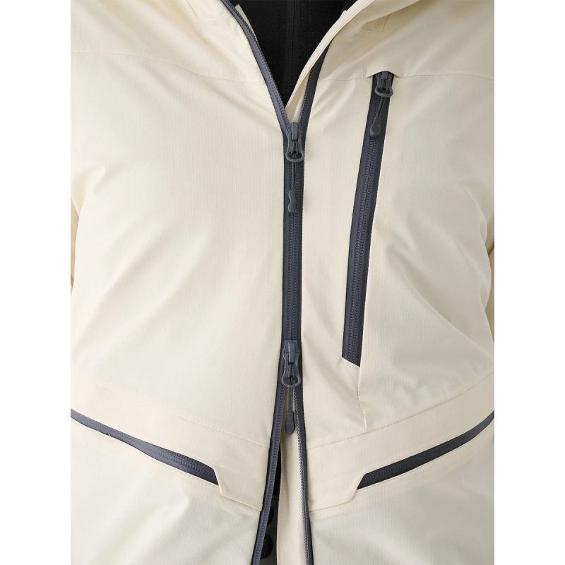 Functionality is ensured by, among other things, underarm ventilation , an adjustable snow skirt , a waterproof two-way main zipper with an internal wind flap, and a system of practical pockets: side and chest pockets with laminated zippers, a goggle pocket, an internal zippered pocket, and a ski pass pocket on the sleeve.