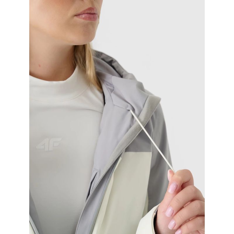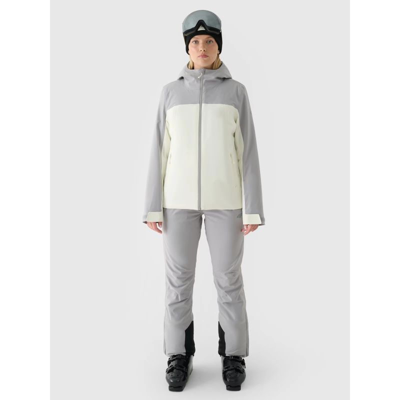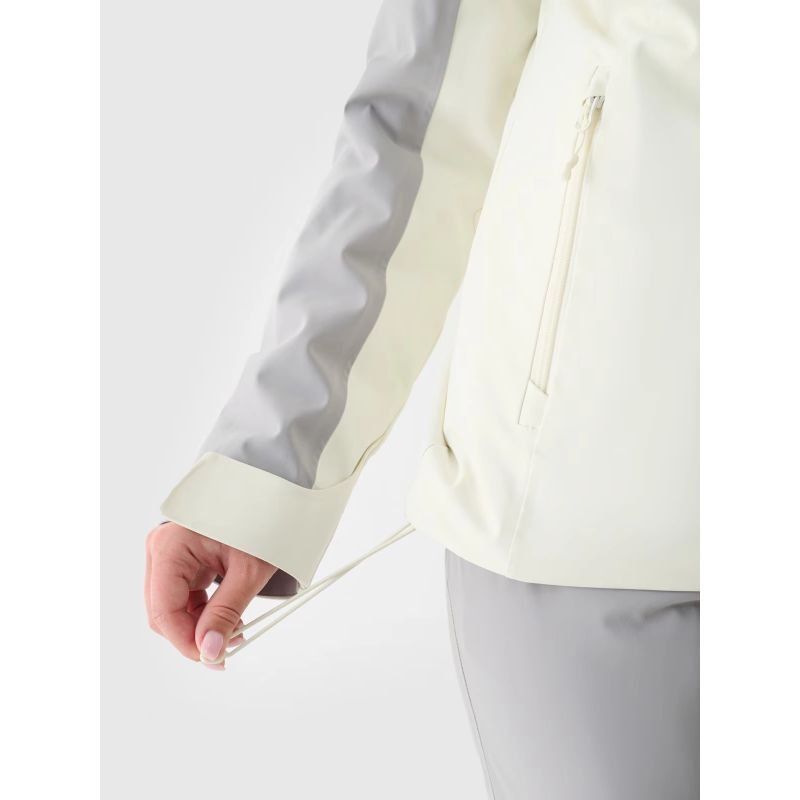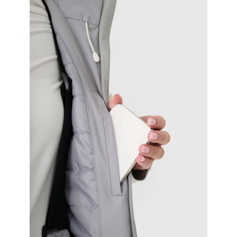 The 4F women's ski jacket features a NeoDry 5000/3000 membrane , which ensures the jacket is waterproof in light rain or snow, while also providing optimal moisture management for urban use. This everyday ski jacket has a regular fit and covers all the basics of moisture protection. The recycled materials are IRR-treated, making them water and dirt repellent. It's windproof, waterproof, and breathable thanks to taped seams. Compared to natural down, synthetic down filling is more durable and easier to care for. Even when wet, it retains warmth much longer and dries relatively quickly compared to natural down. Furthermore, it requires less complicated washing and drying.