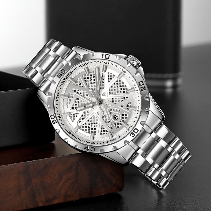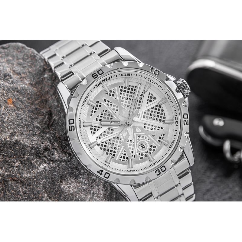 The Skmei 9337 watch exudes pure, masculine elegance with a touch of edge – its striking yet subtle color scheme captivates. The silver case and bracelet create a solid, classic foundation that contrasts perfectly with the three-dimensional dial in shades of silver. This dial, with its 3D elements, adds depth and character, while the silver, fluorescent indexes and hands ensure the watch remains legible at all times.