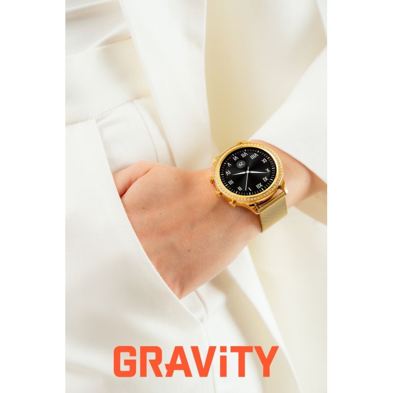 Meet the Gravity GT5 – a women's smartwatch created for those who want more from modern technology. Its elegant design, rhinestones, high-quality craftsmanship, and intuitive operation make it the perfect companion for both everyday wear and evening meetings. The vibrant display ensures excellent readability, while advanced health features like blood pressure and sleep monitoring, cinema mode, and activity mode help you navigate your daily life. The GT5's sports modes motivate you to stay active, while its durable design and water resistance ensure reliability in any situation. A multi-day battery means you can forget about daily charging, while full smartphone integration makes it easy to access notifications, calls, and music. The Gravity GT5 is more than just a smartwatch – it's a personal assistant, trainer, and stylish accessory all in one, making every day easier, healthier, and more convenient.