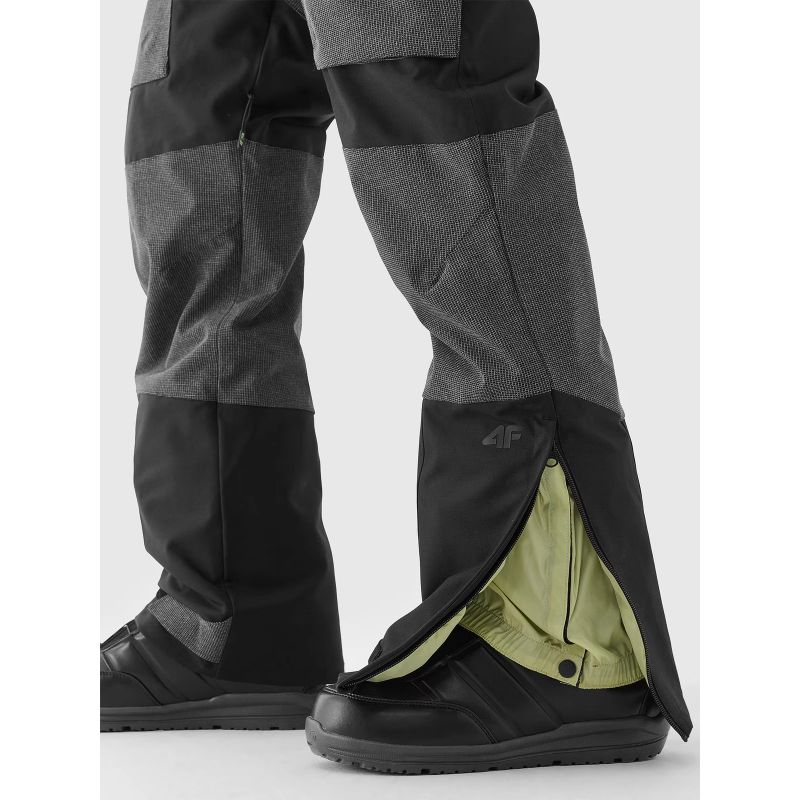 These men's winter snowboard pants feature two zippered side pockets, a zippered chest pocket with an additional snap-button placket. These ski and snowboard pants also feature a zippered ventilation system on the inner thighs. The waistband features a triple zipper, Velcro, and snap closure. Additionally, Velcro straps at the hips allow for a precise fit. Reflective elements enhance visibility on the slopes.
