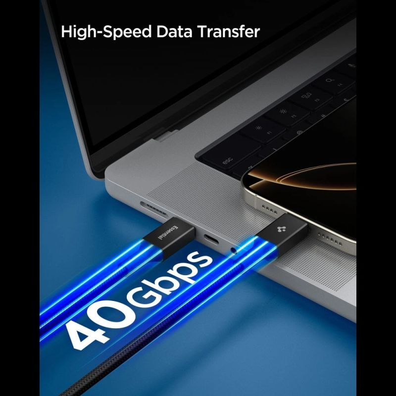 The Spigen Essential EB24015CC is a professional Type-C cable designed for the most demanding devices. It supports Power Delivery charging up to 240W, ensuring lightning-fast and stable charging for laptops, tablets, and smartphones with high power requirements. The cable meets the latest technological standards, offering a comprehensive solution for professional applications.
