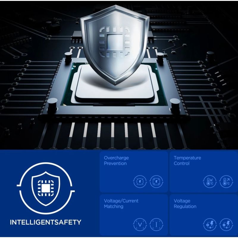 Quantum Boost technology automatically adjusts charging power to match connected devices, maximizing their efficiency. Built-in Overcharge Prevention, Voltage Matching, and Voltage Regulation features protect devices against overcharging, excessive voltage, and unstable current, ensuring safe and stable charging in all conditions.