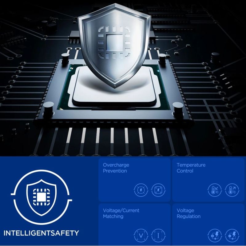 Quantum Boost technology automatically adjusts charging power to match connected devices, maximizing their efficiency. Built-in Overcharge Prevention, Voltage Matching, and Voltage Regulation features protect devices against overcharging, excessive voltage, and unstable current, ensuring safe and stable charging in all conditions.