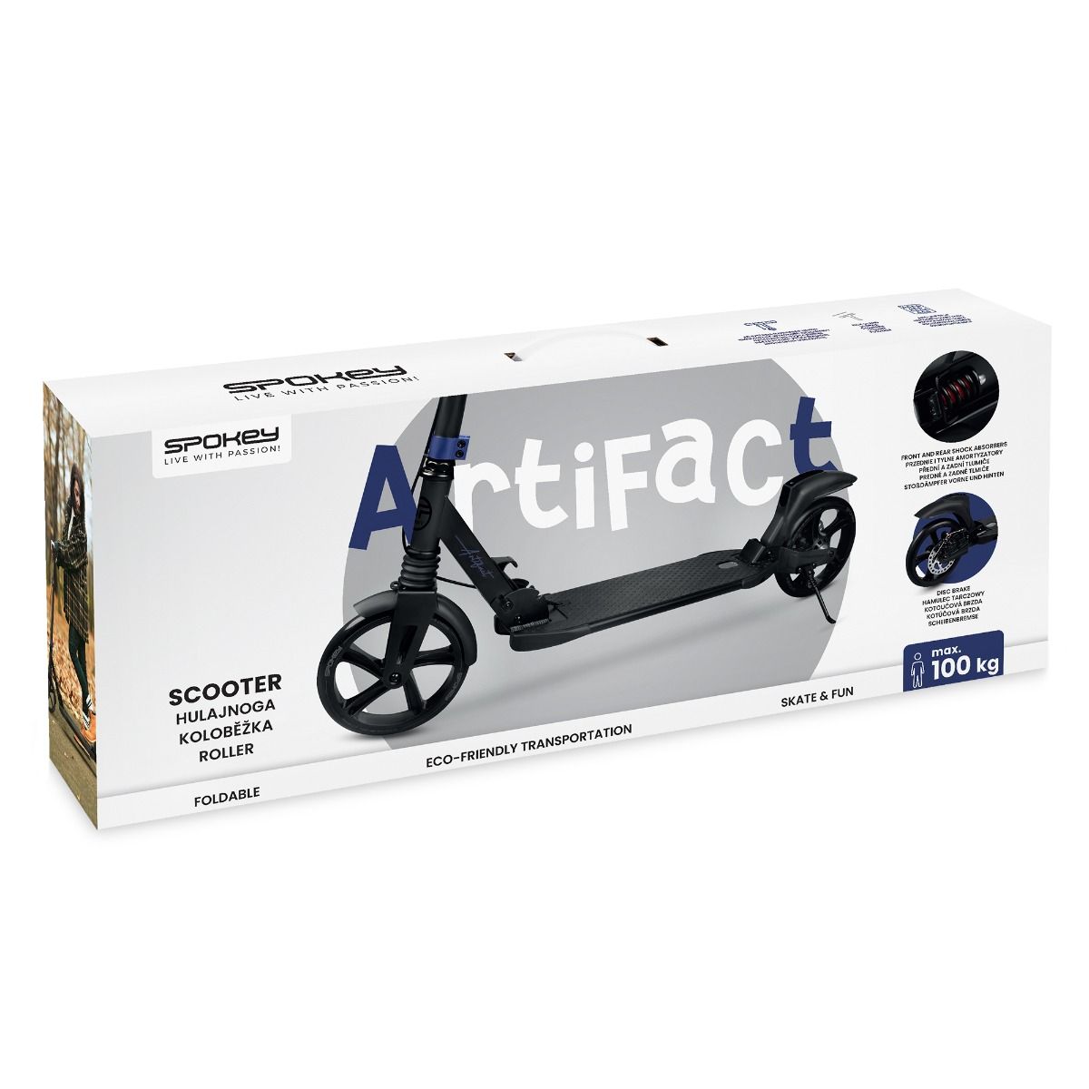 The Artifact is an exceptionally comfortable and functional city scooter that will meet the expectations of two-wheeled enthusiasts of all skill levels. Thanks to its adjustable handlebar height, shock absorbers, and large wheels, navigating urban spaces on this scooter will be enjoyable and efficient. It's a great eco-friendly alternative to other means of urban transportation. Key features: Adjustable handlebar height: adapts to the user's height (90-95-105 cm). Dual brake system: foot and hand (disc) provide full speed control. Front and rear suspension: reduces vibrations when riding over uneven surfaces. Large 200 mm wheels and ABEC-9 bearings: smooth movement and easy high speeds. Anti-slip deck: guarantees stability and safety while riding. Compact design: easy folding, transport, and convenient storage. The Artifact city scooter features a dual suspension system (front and rear), making it the ideal solution for those looking for a comfortable means of transportation around the city. The lightweight aluminum construction combines durability with mobility. Large 200mm polyurethane wheels ensure a comfortable and efficient ride, even on uneven surfaces, and high-quality ABEC-9 bearings ensure smooth and efficient movement. Adjustable handlebar height makes this scooter suitable for users of all heights, while ergonomic handles provide a comfortable grip and greater control. A large, non-slip deck ensures comfortable use, and the foldable design allows for convenient transport and storage. Why choose this scooter? Ride comfort: Shock absorbers and large wheels make this scooter a breeze, even on uneven surfaces. Control: Dual brakes give you full control over speed and stopping. Mobility and space-saving: The foldable design facilitates transport and storage in tight spaces. Durability and quality: Robust materials and EN-14619 certification guarantee long-lasting use. Versatility: Suitable for both recreation and daily commuting to work or school. Technical data: Material: aluminum Wheels: 82A PU, diameter 200 mm Bearings: ABEC-9 Dimensions: 93 x 37 x 95-105 cm Dimensions after folding: 90 x 16 x 33 cm Handlebar height: adjustable, 90-95-105 cm Braking system: foot, hand disc Weight: 6 kg Max. user weight: 100 kg Standard: EN-14619 Skill level: intermediate Safety notes: Personal protective equipment must be worn. Not suitable for children weighing more than 100 kg To be used under adult supervision. Do not use in road traffic. Instructions for use