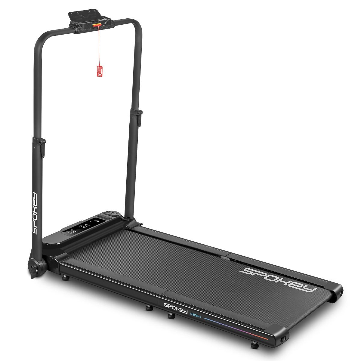 The Spokey DASH+ is a compact, half-folding walking pad that's perfect for home use. Equipped with Bluetooth, a phone holder, a safety key, and a remote control, it offers a comfortable workout even in a small space. Introduction: The Spokey DASH+ is a modern, half-folding walking pad that combines functionality with space-saving functionality. Thanks to its compact design, LED display, and intuitive remote control, the DASH+ is perfect for home use, enabling a comfortable walking workout. Additional features like Bluetooth, a safety key, and a smartphone holder increase convenience and safety. Why is the Spokey DASH+ treadmill worth trying? Bluetooth: The Bluetooth function allows you to connect external devices, such as a phone or tablet, directly to the treadmill. This allows you to control music using the remote control and listen to your favorite songs while training. The half-folding DASH+ was designed for users who value space-saving convenience. The treadmill folds in half, making it much easier to store – both vertically and horizontally. It's an ideal solution for smaller apartments and home gyms. Safety Key: For ease of use, the treadmill is equipped with a special safety key that allows you to immediately stop the device in an emergency. Smartphone Holder: An integrated phone or tablet holder ensures your favorite media, training apps, or videos are always at your fingertips. You can conveniently use your mobile device while walking without worrying about its stability. Speed Control Remote: The treadmill comes with a remote control that allows for smooth and convenient speed adjustment without having to stop. Furthermore, you can also use the remote to switch songs on your paired device, making operation even easier and allowing you to focus on your workout. Detailed Description: The DASH+ treadmill is the perfect choice for those who want to train in comfort without sacrificing space for sports equipment. Its compact design allows for easy storage – after a workout, simply fold it and store it vertically or horizontally. The LED display allows you to track key parameters such as time, distance, speed, and calories burned. The remote control allows for smooth speed adjustment, while the built-in Bluetooth module allows you to connect to your phone and control music without interrupting your workout. The DASH+ treadmill also has a practical smartphone holder and a safety key that will protect the user in the event of an emergency need to stop the treadmill. Technical data Type: electric treadmill (walking pad) Motor power: 1.25 HP DC Maximum speed: 6 km/h Display: LED Display functions: time, distance, speed, calories Product size: 128 × 67.5 × 97.5 cm Folded size: 79.5 x 67.5 x 16 cm Belt size: 105 × 40 cm Storage: foldable in half, vertically or horizontally Device weight: 27 kg Maximum user weight: 110 kg Extras: smartphone holder, remote control, safety key, speed control remote control Transport wheels: yes Certificates, standards and warnings Compliance with EU safety standards. The product is intended for home use only. This device is not intended for children. Use and Care: Use the treadmill on a flat, stable, and dry surface, away from moisture and heat sources. Before starting a workout, ensure the treadmill is properly unfolded and secured. Regularly clean the running belt and exterior surfaces with a dry or slightly damp cloth. Do not use strong detergents or chemicals for cleaning. Do not allow dust to accumulate around the motor and folding mechanism. After finishing your workout, unplug the treadmill from the power source. Fold the treadmill only after it has come to a complete stop and cooled down. Store the treadmill in a horizontal or vertical position – according to the user's location and preference. Regularly check the treadmill's technical condition – belt tension, component stability, and remote control functionality. Do not exceed the maximum user weight (110 kg). For your safety, do not use the treadmill barefoot or in inappropriate footwear. Frequently Asked Questions: Is the DASH+ treadmill suitable for running? No – the DASH is a walking pad, meaning it is designed for walking or marching. The maximum speed is 6 km/h. What devices can I connect via Bluetooth? You can connect your phone, tablet, or other mobile device to play music and control it with the remote control. Can the treadmill be stored vertically? Yes, the DASH folds in half and can be stored both vertically and horizontally. Can the treadmill be stored vertically or horizontally?