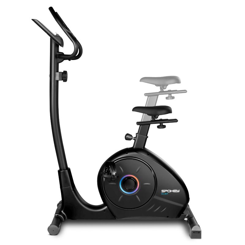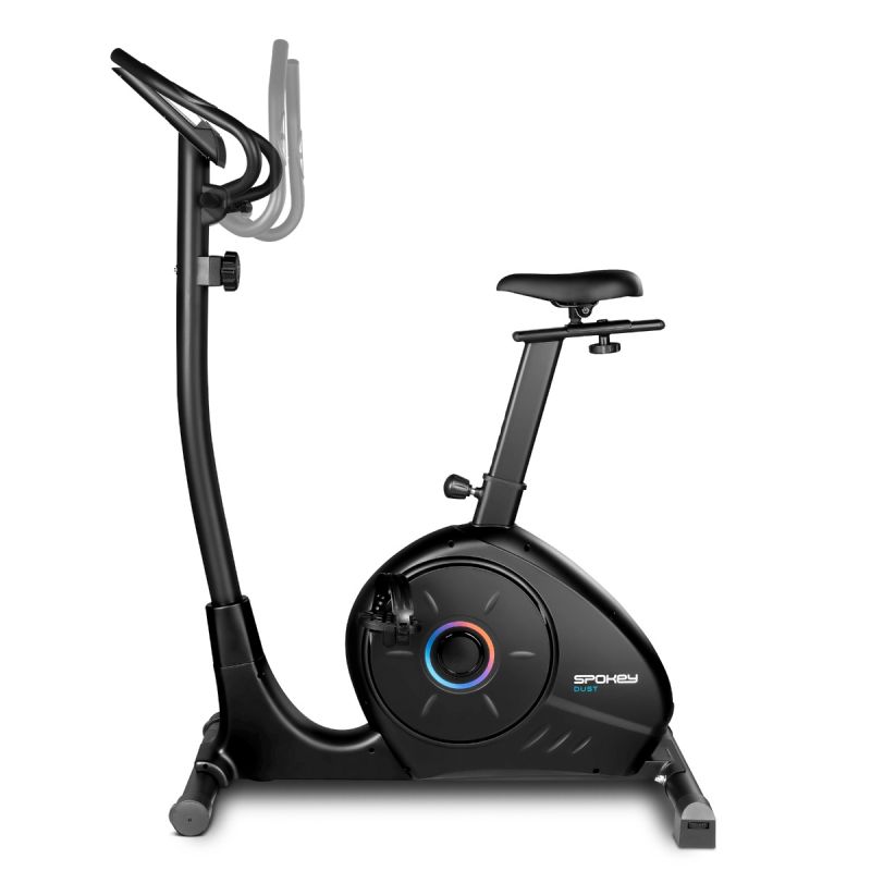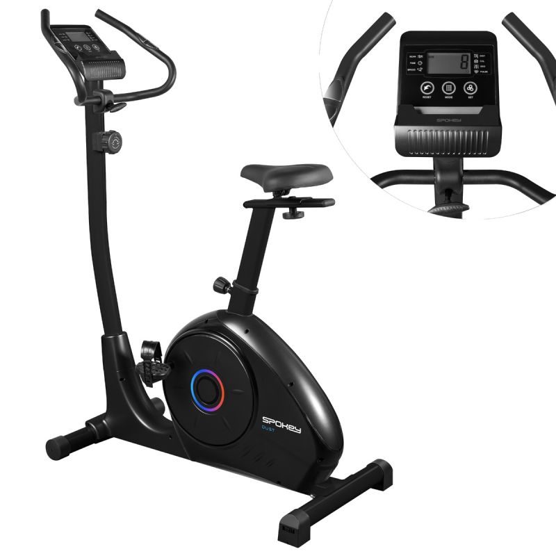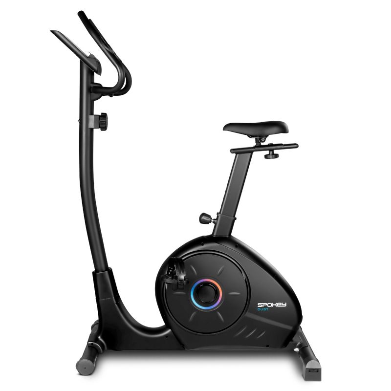 Magnetic Exercise Bike - Spokey DUST The compact Spokey DUST exercise bike with magnetic resistance and 8-level adjustment is ideal for home workouts. Equipped with an LCD display with heart rate measurement, an adjustable saddle and handlebars, and a tablet or phone holder. Introduction: Spokey DUST is a modern exercise bike that allows you to enjoy a comfortable workout without leaving home. Thanks to 8-level manual resistance adjustment and the smooth operation of the 8 kg magnetic flywheel, you can match the intensity of your exercise to your goals – from a light warm-up to a demanding cardio workout. The ergonomic saddle, adjustable vertically and horizontally, and adjustable handlebar angle ensure a comfortable position for every user. The LCD display presents all key data – time, speed, distance, calories, heart rate, and total mileage – motivating consistency and progress. Key Features: Magnetic resistance system (8 kg) – ensures quiet and smooth operation, ideal for home workouts. Manual resistance adjustment – 8 intensity levels – precisely adjust the workout difficulty to your needs. Ergonomic saddle, adjustable vertically and horizontally – ensures proper body positioning and comfort while riding. Adjustable handlebar angle – allows you to find the optimal position depending on your riding style. Pulse measurement – monitor your heart rate to keep your workout in the right effort zone. LCD display with SCAN function – monitor time, distance, speed, calories, heart rate, and total workout progress. Space for a tablet or smartphone – exercise with music, a movie, or a fitness app. Transport wheels – make it easy to move the bike after your workout. Detailed description The Spokey DUST exercise bike is a compact solution for people who value effective training at home. A quiet magnetic resistance system ensures smooth operation, and the 8-level adjustment allows you to adjust the resistance to the user's fitness level. DUST supports calorie burning, strengthens leg and gluteal muscles, and is safe for joints. Thanks to the adjustable saddle and handlebar, every user – regardless of height – can find the perfect riding position. The easy-to-read LCD screen provides all the essential training information, and the tablet holder allows you to combine exercise with your favorite entertainment. The solid construction and compact dimensions (105 × 52 × 145 cm) make the bike ideal even for smaller apartments. Technical data and parameters Type: upright bike Resistance type: magnetic Flywheel weight: 8 kg Resistance adjustment: manual, 8 levels Display functions: scan, time, speed, distance, calories, pulse, total mileage Pulse measurement: yes Dimensions: 105 × 52 × 145 cm Saddle adjustment: vertical and horizontal Handlebar adjustment: adjustable tilt angle Space for a tablet or smartphone: yes Device weight: 29 kg Max. user weight: 100 kg Transport wheels: yes Use and care: Place the bike on a stable, flat surface. After training, wipe the frame with a dry or slightly damp cloth. Do not use strong detergents or caustic agents. Regularly check the tightness of screws and the stability of components. Do not exceed the maximum user weight (100 kg). Store in a dry place, away from moisture and heat sources. Frequently asked questions Q: Is the Spokey DUST bike suitable for beginners? A: Yes, thanks to the smooth resistance adjustment and comfortable seating position, it is perfect for those starting home workouts. Q: Can the bike be adjusted to the user's height? A: Yes, both the saddle and handlebars are adjustable, allowing for a perfect position. Q: Is the bike quiet? A: Yes, the magnetic system guarantees very quiet and smooth operation – ideal for training at home. Q: Can I use a tablet while riding? A: Yes, the bike has a dedicated space for a tablet or smartphone. Q: Is the bike easy to move? A: Yes, it is equipped with practical transport wheels. Safety information: WARNING! If you experience pain or pressure in your chest, irregular heartbeat, shortness of breath, feel faint, or experience discomfort during exercise, STOP YOUR TRAINING IMMEDIATELY! Consult a physician before continuing. This device is not intended for use by individuals (including children) with reduced physical abilities, physical or mental disabilities, or by individuals who are inexperienced in exercising on similar equipment or lack sufficient information and have not read the treadmill's operating instructions. These individuals may only exercise on the device under the strict supervision of an authorized person directly responsible for their safety. Under no circumstances should children be allowed to play with the device. Download the manual: