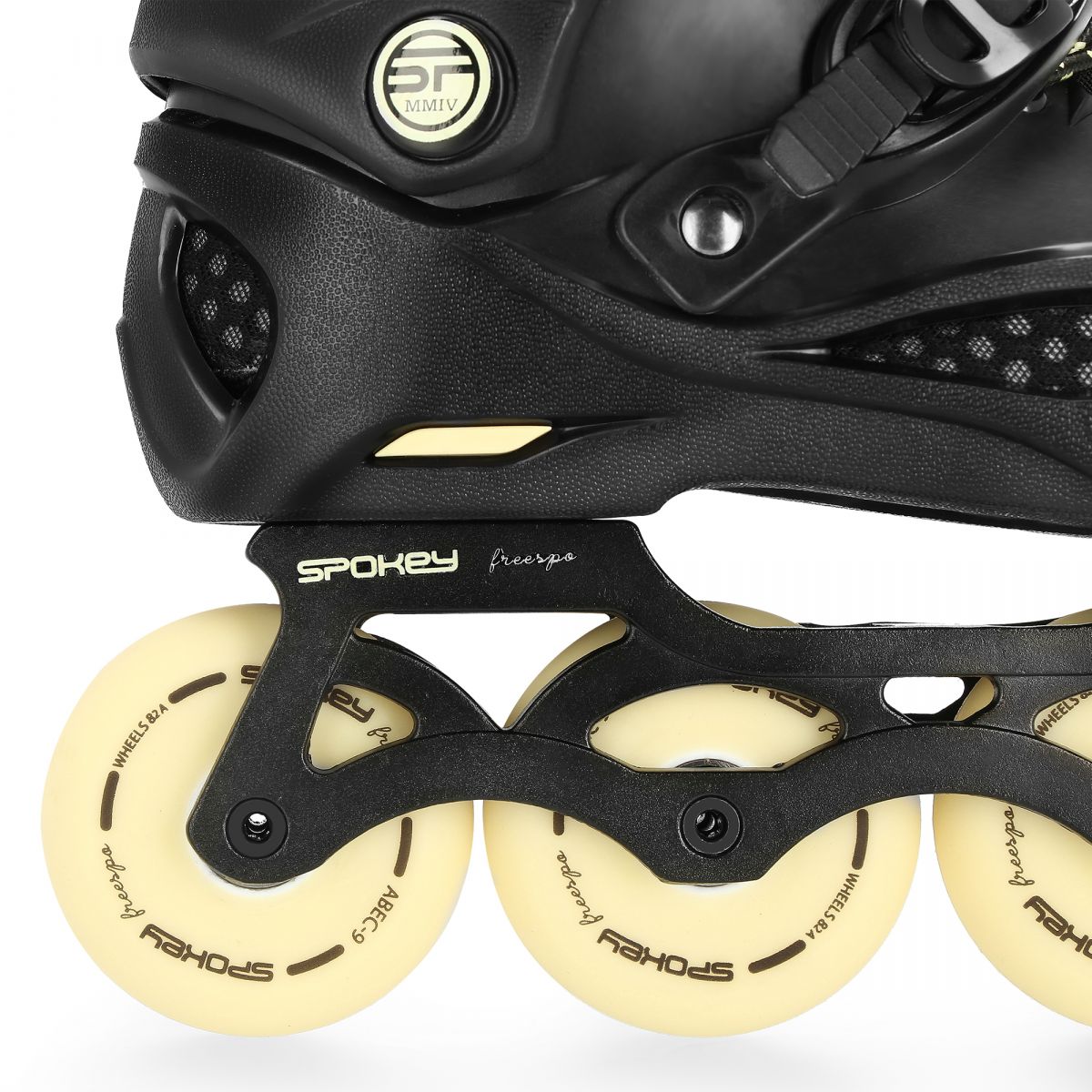 Spokey FREESPO inline skates: a hard shell with a removable, highly ventilated honeycomb-shaped foam insert; a triple closure with two buckles and laces. This allows for an optimal fit and ensures safety during fast slalom, urban, and freeskate skating! CNC-cut aluminum frame for maximum durability and strength; high-quality ABEC9 Chrome bearings; a versatile inline skate, designed for fast, dynamic freestyle and recreational skating, as well as for beginners, while maintaining safety thanks to its excellent technical parameters.