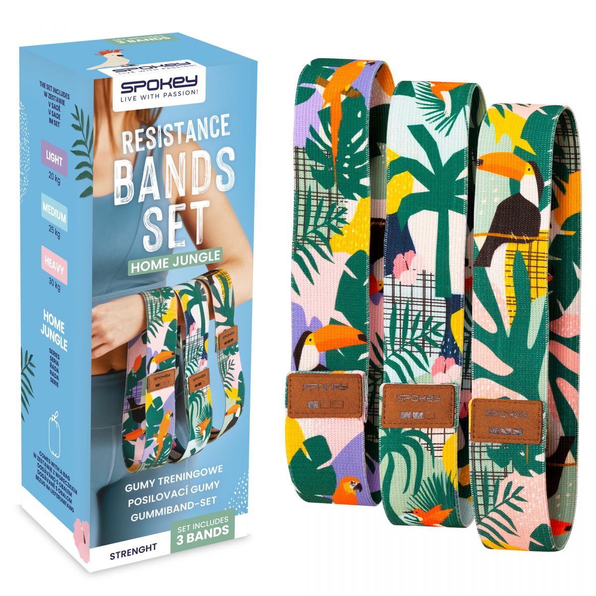 The Spokey HOME JUNGLE Training Band Set: 3 universal and versatile closed-loop fitness bands with varying resistance strengths (20 kg, 25 kg, 30 kg) are ideal for stretching, fitness, Pilates, and yoga exercises. Made of durable cotton, they resist deformation and withstand extremely strong stretching. They help diversify your workouts by engaging the muscle groups you care about. The Spokey HOME JUNGLE closed-loop training bands allow you to maximize your workout results and focus on the body parts you care about most. You can use them to train your arms, thighs, legs, or glutes. Regardless of your skill level, you can choose the right band for your needs with this set of three bands, as each has a different resistance level. Three bands with varying tension levels. The Spokey HOME JUNGLE training band set is an excellent choice for both beginner athletes and professionals. They're great for helping develop proper exercise technique and as an option for those who like to push their muscles to their limits! HOME JUNGLE resistance bands work similarly to an expander or yoga belt – they enable exercises involving stretching and lateral movements (e.g., chest exercises). Their properties and length allow you to successfully expand your range of exercises. Closed-loop bands are perfect for any situation requiring a smaller range and higher resistance. The Spokey HOME JUNGLE set includes three mini bands with varying tension levels: S - 20 kg M - 25 kg L - 30 kg Engage the muscle groups you care about. HOME JUNGLE offers three fitness bands that you can train with anywhere – at the club, at home, at the gym, or outdoors. They're recommended by personal trainers because they help you diversify your workout by engaging the muscle groups you care about. They're an excellent choice for fitness, Pilates, yoga, and joint mobilization training. Made of very strong cotton, they retain their shape and withstand intense stretching. Technical specifications: Material: cotton Dimensions: 32 x 5 cm Set includes: 3 pieces Resistance: 20 kg, 25 kg, 30 kg