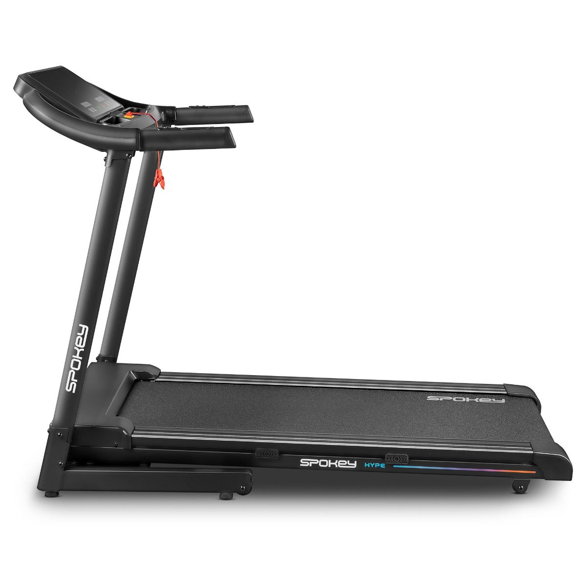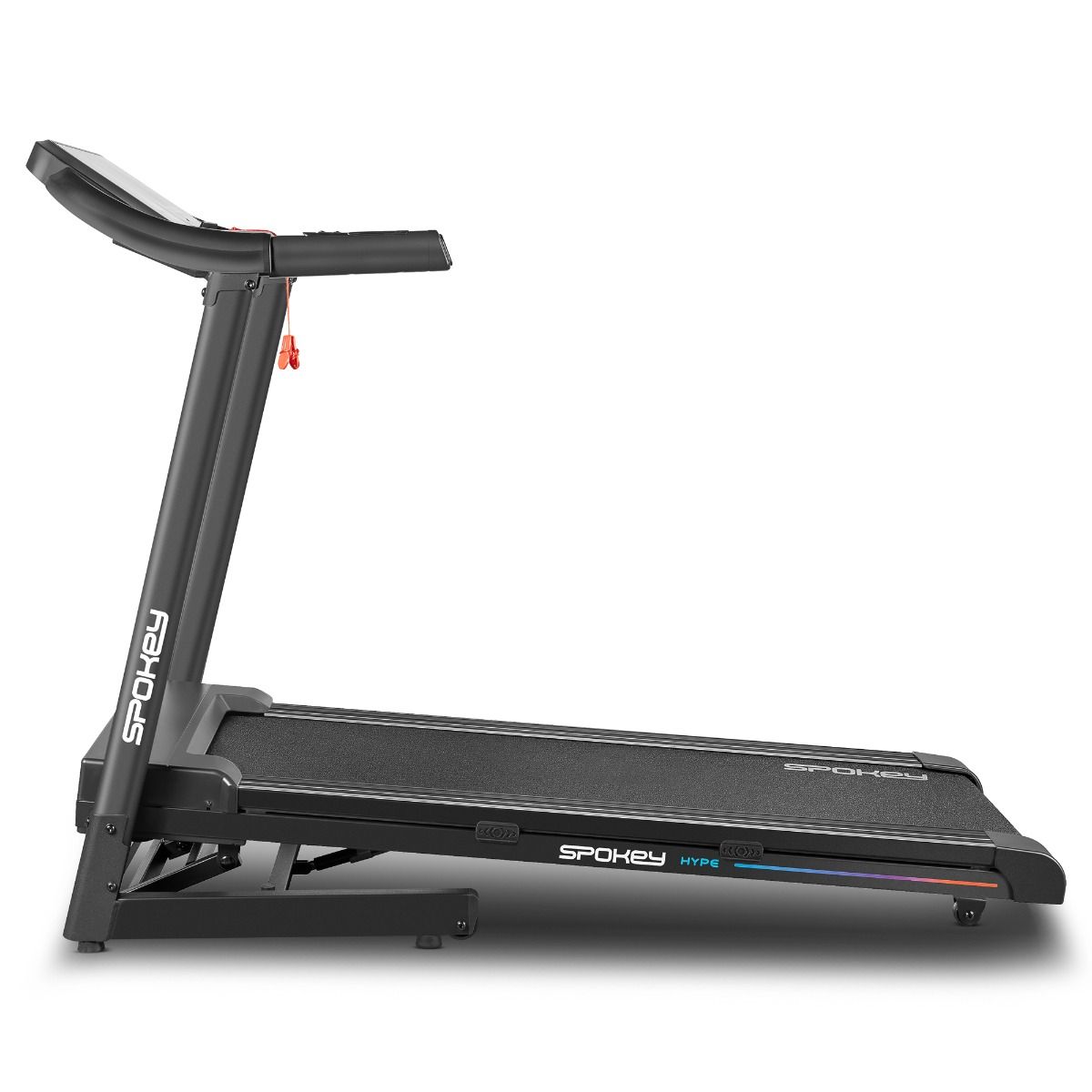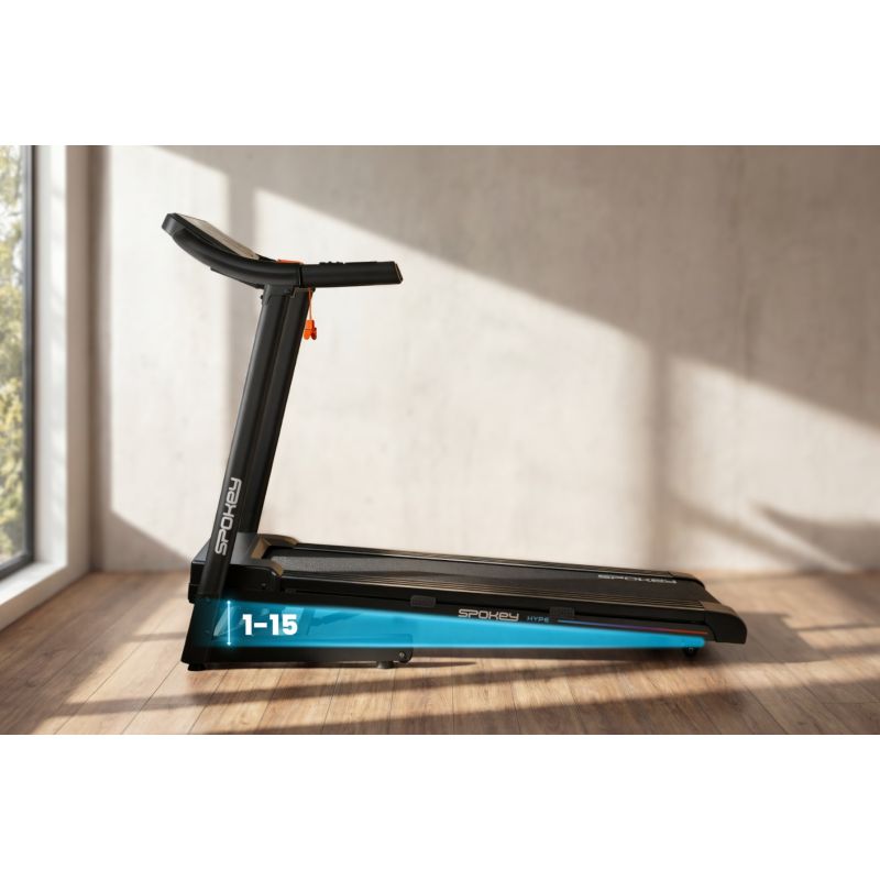 Spokey HYPE Foldable Electric Treadmill with Automatic Incline Adjustment (1-15%), 15 training programs, and customizable training for up to three users. Equipped with a large LED screen, shock absorption, heart rate sensors, and practical tablet and water bottle holders, it's perfect for everyday home workouts. Introduction: Spokey HYPE is a home treadmill that combines ease of use with a wide range of training options. Featuring automatic incline adjustment, 15 programs, and the ability to personalize training plans for up to three users, it allows you to tailor your workout to your individual needs. Thanks to its foldable design, shock absorption, and practical tablet and water bottle holders, running at home with the HYPE treadmill becomes truly comfortable and motivating. Why is it worth trying the Spokey HYPE treadmill? 15 Training Programs: A comprehensive set of 15 pre-programmed training programs allows you to diversify your workouts and adjust the intensity to your abilities. Each program is divided into 20 sections, with speed and incline automatically changing – a great way to simulate varying conditions and avoid monotony while running. 3 Personalized Programs: The treadmill allows you to create and save your own training plans for three separate users. This allows everyone in your household to quickly choose their mode and train according to their individual needs, without having to re-set parameters. Tablet and Bottle Holder: During your workout, everything you need is always at hand – your favorite drink within reach and a tablet or smartphone on which you can watch a movie, listen to music, or use training apps. It's a combination of convenience and motivation. Cushioning: The cushioning system effectively absorbs shocks generated while running, reducing stress on joints and providing greater comfort. This makes every workout more enjoyable and more effective for the body, even during longer sessions. Detailed Description: The Spokey HYPE electric treadmill is your way to an effective workout without leaving home. The powerful 1.75 HP motor allows you to reach speeds of up to 14 km/h – perfect for both brisk walking and intense running. The wide running belt (122 x 40 cm) allows for complete freedom of movement, and the cushioning system makes every step comfortable and smooth. Train whenever you want and on your own terms! With 15 training programs, you can easily adjust the intensity of your workout, and customization for up to three people means everyone can use the treadmill comfortably. The large LED screen displays key data in real time, and heart rate sensors built into the handrails allow you to monitor your heart rate. The HYPE treadmill is designed with space-saving in mind – it can be folded and stored vertically, and transport wheels make it easy to move. Practical details like a tablet and bottle holder enhance comfort, while a safety key provides additional protection during your workout. Technical data Type: electric treadmill Motor power: 1.75 HP Maximum speed: 14 km/h Incline: automatic: 1–15% Display: LED Display functions: time, distance, speed, pulse, calories Training programs: 15 + 3 personalised Pulse measurement: yes Running belt: 122 × 40 cm Dimensions: 143 × 67 × 111 cm Dimensions after folding: 64 × 67 × 135 cm Device weight: 47 kg Maximum user weight: 110 kg Folding: hydraulic Tablet and bottle holder: yes Transport wheels: yes Bluetooth: yes Certificates, standards and warnings Compliance with EU safety standards. The product is intended for home use only. The device is not intended for children. Use and care Before first use, make sure that the treadmill is on a stable and level surface. It is recommended to place the equipment on a shock-absorbing mat to reduce noise and vibrations. After each workout, turn the device off using the button and then unplug it. Regularly clean the running belt and housing with a soft, damp cloth. Avoid using aggressive detergents. Do not store the equipment in damp or very sunny rooms. The treadmill is intended for home use only – do not use it in commercial environments or make it accessible to children. Frequently asked questions: Is the Spokey HYPE treadmill suitable for intensive training? Yes, thanks to the 1.75 HP engine and speeds of up to 14 km/h, the HYPE is suitable for both walking and regular running training. Can the Spokey HYPE treadmill be folded? Yes, thanks to the hydraulic system, it can be folded and stored vertically. Transport wheels make it easy to move. Does the treadmill have shock absorption? Yes, four shock absorption points reduce the load on joints, improving running comfort.