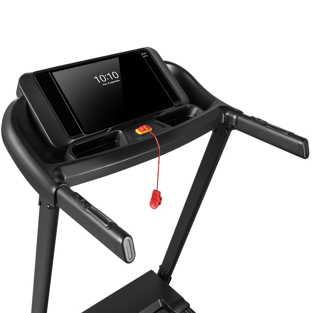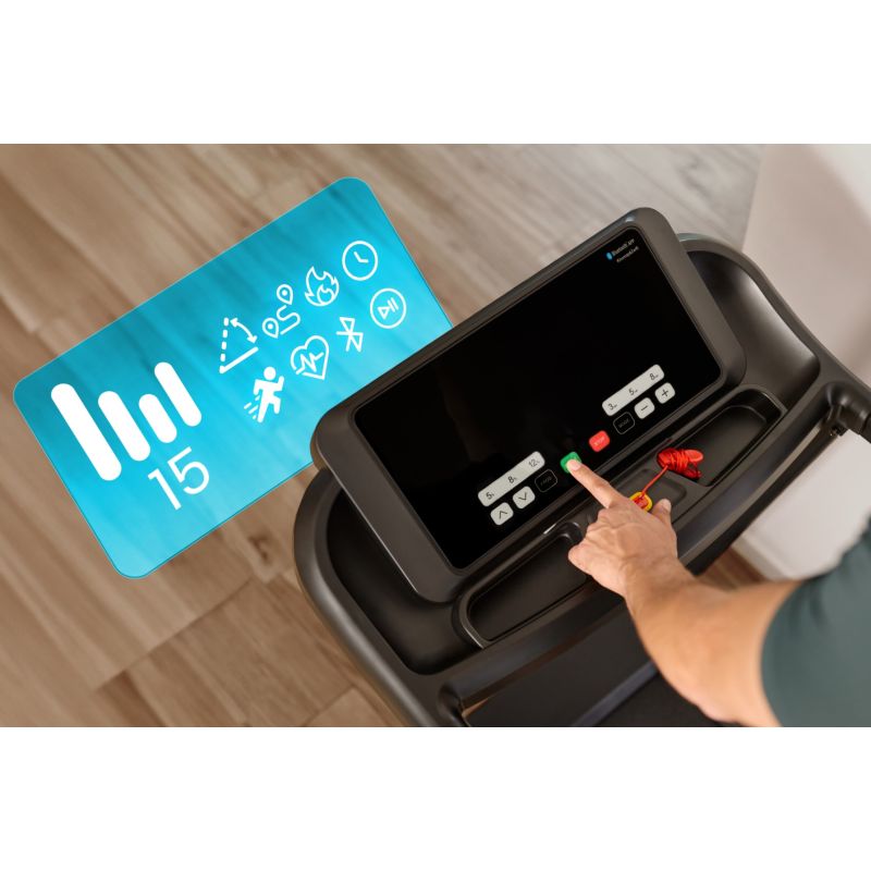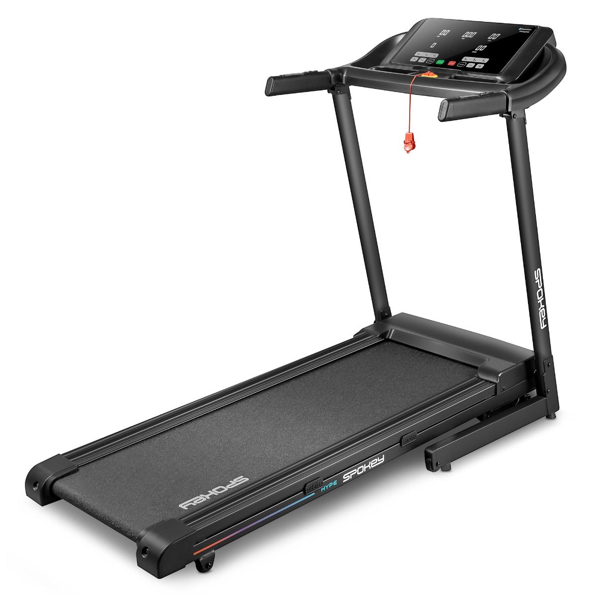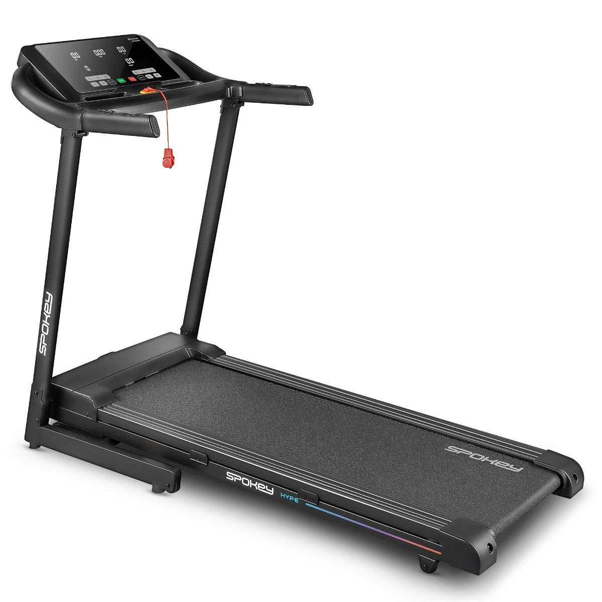 Spokey HYPE Foldable Electric Treadmill with Automatic Incline Adjustment (1-15%), 15 training programs, and customizable training for up to three users. Equipped with a large LED screen, shock absorption, heart rate sensors, and practical tablet and water bottle holders, it's perfect for everyday home workouts. Introduction: Spokey HYPE is a home treadmill that combines ease of use with a wide range of training options. Featuring automatic incline adjustment, 15 programs, and the ability to personalize training plans for up to three users, it allows you to tailor your workout to your individual needs. Thanks to its foldable design, shock absorption, and practical tablet and water bottle holders, running at home with the HYPE treadmill becomes truly comfortable and motivating. Why is it worth trying the Spokey HYPE treadmill? 15 Training Programs: A comprehensive set of 15 pre-programmed training programs allows you to diversify your workouts and adjust the intensity to your abilities. Each program is divided into 20 sections, with speed and incline automatically changing – a great way to simulate varying conditions and avoid monotony while running. 3 Personalized Programs: The treadmill allows you to create and save your own training plans for three separate users. This allows everyone in your household to quickly choose their mode and train according to their individual needs, without having to re-set parameters. Tablet and Bottle Holder: During your workout, everything you need is always at hand – your favorite drink within reach and a tablet or smartphone on which you can watch a movie, listen to music, or use training apps. It's a combination of convenience and motivation. Cushioning: The cushioning system effectively absorbs shocks generated while running, reducing stress on joints and providing greater comfort. This makes every workout more enjoyable and more effective for the body, even during longer sessions. Detailed Description: The Spokey HYPE electric treadmill is your way to an effective workout without leaving home. The powerful 1.75 HP motor allows you to reach speeds of up to 14 km/h – perfect for both brisk walking and intense running. The wide running belt (122 x 40 cm) allows for complete freedom of movement, and the cushioning system makes every step comfortable and smooth. Train whenever you want and on your own terms! With 15 training programs, you can easily adjust the intensity of your workout, and customization for up to three people means everyone can use the treadmill comfortably. The large LED screen displays key data in real time, and heart rate sensors built into the handrails allow you to monitor your heart rate. The HYPE treadmill is designed with space-saving in mind – it can be folded and stored vertically, and transport wheels make it easy to move. Practical details like a tablet and bottle holder enhance comfort, while a safety key provides additional protection during your workout. Technical data Type: electric treadmill Motor power: 1.75 HP Maximum speed: 14 km/h Incline: automatic: 1–15% Display: LED Display functions: time, distance, speed, pulse, calories Training programs: 15 + 3 personalised Pulse measurement: yes Running belt: 122 × 40 cm Dimensions: 143 × 67 × 111 cm Dimensions after folding: 64 × 67 × 135 cm Device weight: 47 kg Maximum user weight: 110 kg Folding: hydraulic Tablet and bottle holder: yes Transport wheels: yes Bluetooth: yes Certificates, standards and warnings Compliance with EU safety standards. The product is intended for home use only. The device is not intended for children. Use and care Before first use, make sure that the treadmill is on a stable and level surface. It is recommended to place the equipment on a shock-absorbing mat to reduce noise and vibrations. After each workout, turn the device off using the button and then unplug it. Regularly clean the running belt and housing with a soft, damp cloth. Avoid using aggressive detergents. Do not store the equipment in damp or very sunny rooms. The treadmill is intended for home use only – do not use it in commercial environments or make it accessible to children. Frequently asked questions: Is the Spokey HYPE treadmill suitable for intensive training? Yes, thanks to the 1.75 HP engine and speeds of up to 14 km/h, the HYPE is suitable for both walking and regular running training. Can the Spokey HYPE treadmill be folded? Yes, thanks to the hydraulic system, it can be folded and stored vertically. Transport wheels make it easy to move. Does the treadmill have shock absorption? Yes, four shock absorption points reduce the load on joints, improving running comfort.