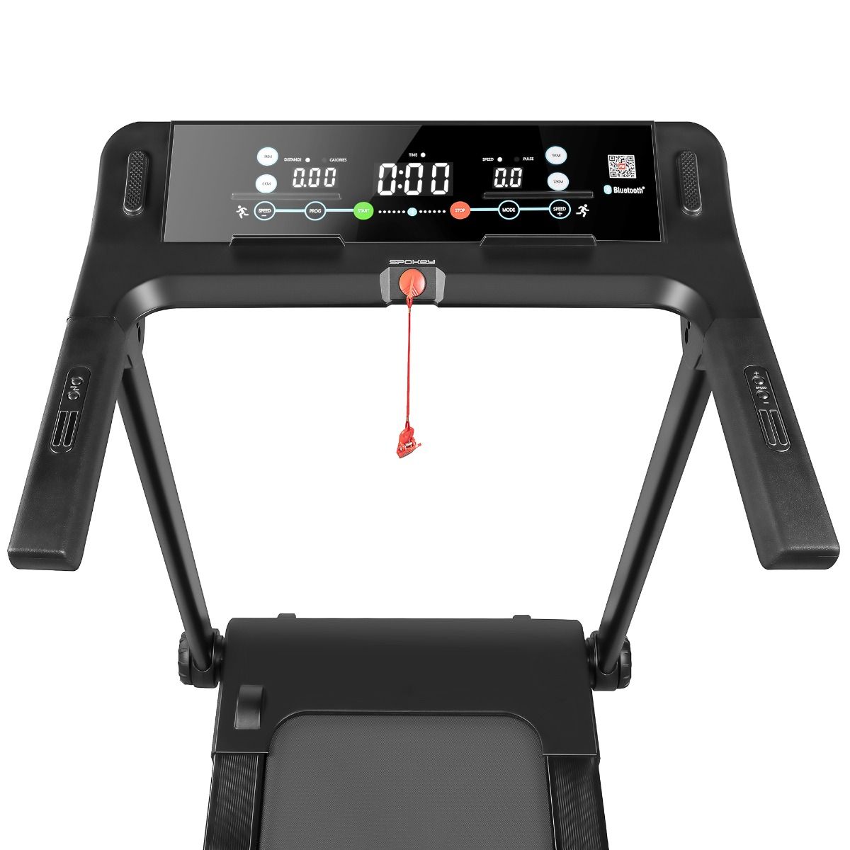 The Spokey LEAN Compact Electric Treadmill – Interactive Training in Your Home. A foldable home treadmill with an LED display, 12 training programs, and Bluetooth connectivity. It allows for real-time heart rate, calorie burn, and body fat measurement. Compatible with popular training apps: Kinomap, Zwift, and FitShow. Equipped with a dynamic LED backlight and a tablet holder. Introduction: Want to run regardless of the weather while also being able to track your progress? The Spokey LEAN Compact Electric Treadmill is the perfect home solution – foldable, modern, with a large LED display, heart rate measurement, and body fat analysis. Connect it to the FitShow, Zwift, and Kinomap apps, play your favorite music or TV show on your tablet, and enjoy a great workout at your own pace. Why is it worth trying the Spokey LEAN Electric Treadmill? Compatibility with Training Apps: Connect the treadmill to Kinomap, Zwift, or FitShow and train in virtual environments or with an online trainer. It's a simple way to boost motivation and break the monotony of running. Large LED display with heart rate and body fat measurement: The clear screen displays parameters such as time, distance, speed, calories burned, and pulse, and after entering additional data, also estimates body fat. Running belt with LED lighting: The treadmill's colorful backlight dynamically changes color depending on your running speed. This interesting addition will energize you and provide a unique atmosphere during every workout. 12 Programs: The LEAN treadmill is equipped with a set of 12 pre-set programs that allow you to easily adjust the exercise intensity to your level of experience and training goals—from burning calories, through improving fitness, to building endurance. Pulse Measurement: Built-in heart rate sensors allow you to monitor your heart rate in real time. This allows you to train in your optimal effort zone, better monitor progress, and more effectively improve your body's performance. Detailed description: The Spokey LEAN is for those who want to comfortably train in the comfort of their home, using modern solutions. A powerful 2.0 HP motor allows for speeds of up to 16 km/h, making it suitable for both recreational walking and intense running. This compact treadmill facilitates regular training without leaving home. Thanks to its many built-in functions, it not only helps you stay in shape but also better monitor your progress. Heart rate measurement and body fat estimation allow for a more informed approach to exercise and better control of results. An additional advantage is the ability to pair the treadmill with popular training apps. Use this feature to track your results and compete with others. It's also a great option to diversify your workout by choosing beautiful running routes from around the world or training with a virtual coach. The LEAN treadmill is designed to fit easily into your home—it can be stored both vertically and horizontally. Its compact design makes it suitable even for smaller spaces. The 125 cm long and 45 cm wide running belt ensures a comfortable workout, and the sturdy construction allows use by people weighing up to 130 kg. Additionally, the treadmill offers many practical features, such as 12 pre-programmed workout programs, an LED-illuminated running belt, a tablet holder, and Bluetooth MP3 functionality. Technical data Type: electric treadmill Motor power: 2.0 HP Maximum speed: 16 km/h LED display: yes Display functions: time, distance, speed, calories, heart rate, body fat Training programs: 12 Dimensions when unfolded: 151 x 76 x 116 cm Running belt size: 125 x 45 cm Device weight: 41 kg Maximum user weight: 130 kg Storage: vertical or horizontal Additional equipment: Bluetooth (Kinomap, Zwift, FitShow), tablet holder, Bluetooth MP3 LED backlight: yes (dynamically changing colors depending on speed) Certificates, standards and warnings Compliance with EU safety standards. The product is intended for home use only. The device is not intended for children. Use and care Before your first workout, connect the treadmill to the app to immediately track your progress. Place the treadmill on a cushioning mat to reduce vibrations and noise. If you're using the body fat measurement feature, enter accurate data – the measurement will be more accurate. Don't forget to warm up before running – use one of the low-intensity programs. After finishing your workout, turn the device off and unplug it. Regularly wipe the surface with a damp cloth – avoid strong detergents. To maintain proper belt tension, check its position and tension every few seconds.