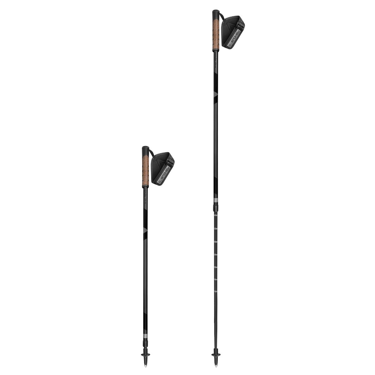 Telescopic Nordic Walking poles made of durable aluminum, equipped with a comfortable Antishock cushioning system that absorbs shocks while walking. The two-segment design with height adjustment from 105 to 135 cm allows for easy adjustment of the pole length to the user's height. When folded to their smallest size, they take up minimal space. The poles are tipped with widia tips for durability and increased abrasion resistance. They feature ergonomic cork handles that fit perfectly in the hand, and a detachable glove with a reflective element. The set includes two rubber tips for walking on asphalt. They are perfect for both summer and winter. Technical data: material: aluminum 6061 number of sections: 2 handles: cork mass glove attachment: detachable pole section fastening: internal antishock tip: fork plate: replaceable weight (2 poles): 440 g length: 105 - 135 cm additionally: rubber pole tips Safety information: After conducting an analysis of the risk related to the use of the Product and on the basis of the analysis of potential hazards related to the use of the Product, pursuant to Art. 9 sec. 7 of Regulation (EU) 2023/988 of the European Parliament and of the Council of 10 May 2023 on general product safety, amending Regulation (EU) No 1025/2012 of the European Parliament and of the Council and Directive (EU) 2020/1828 of the European Parliament and of the Council and repealing Directive 2001/95/EC of the European Parliament and of the Council and Council Directive 87/357/EEC, states that the Product can be used safely and in the manner intended by the Manufacturer without instructions and information on the safety of the Product, due to the lack of obvious risks and hazards associated with the use of the Product.