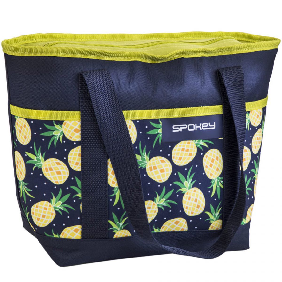 The Spokey San Remo Pineapple Thermal Bag (929520) is a must-have for trips to the beach, family outings, and picnics. This model features a spacious, zippered main compartment with thermal insulation that prevents contents from heating up. The interior is made of aluminum. An additional Velcro pocket is included. Durable handles make it easy to carry. The bag is made of 600D polyester reinforced with PE foam, ensuring quality and durability. Technical specifications: Material: 600D polyester, PE foam, aluminum foil Dimensions: 52 x 20 x 40 cm Capacity: approx. 21 l Maximum equipment weight: 15 kg