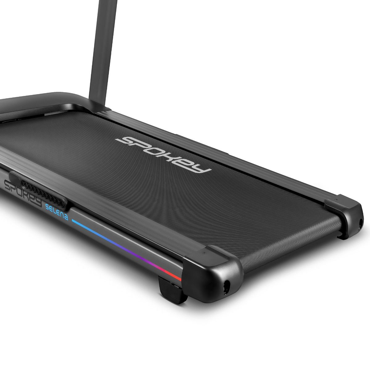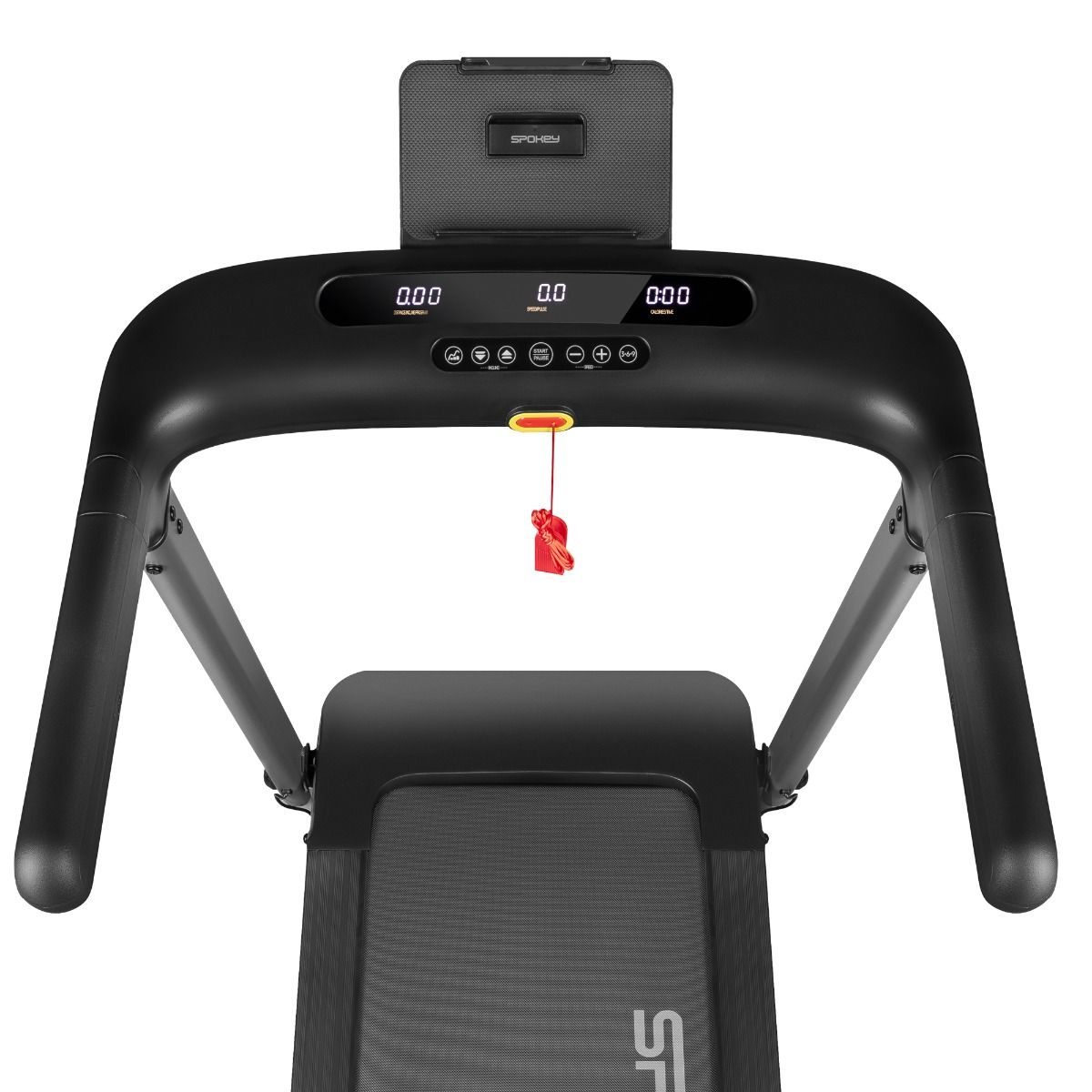 A modern electric treadmill offering up to 16 training programs and automatic incline change for even greater workout variety. A functional display allows you to track your progress and heart rate during exercise. An additional feature is a safety key. Comfortable armrests and a tablet holder make your workout even more comfortable. Technical specifications: Type: electric treadmill Motor power: 1.75 HP, brushless motor Maximum speed: 15 km/h Incline: 1-20 levels, automatic Display: LED Display functions: time, distance, speed, heart rate, calories, incline, pause Pulse measurement: yes Number of training programs: 16 Apps: Kinomap, Zwift, Spax Bluetooth: yes Dimensions: 144 x 76 x 115 cm Running belt size: 120 x 42 cm Device weight: 43 kg Max. User Weight: 110 kg Transport Wheels: Yes Safety Information: Never expose the treadmill to moisture or rain. This treadmill is not intended for outdoor use. Do not use it near a pool or other wet environment. DANGER – Improper connection of the equipment-grounding conductor can result in a risk of electric shock. If in doubt as to whether the product is properly grounded, contact a qualified electrician or serviceman. Do not modify the plug provided with the product – if it will not fit the outlet, have the proper outlet installed by a qualified electrician. WARNING! If you experience chest pain or pressure, irregular heartbeat, shortness of breath, feel faint, or experience any discomfort during exercise, STOP WORKOUT IMMEDIATELY! Consult your physician before continuing. This device is not intended for use by individuals (including children) with reduced physical abilities, physical or mental disabilities, or by individuals who are inexperienced in exercising on similar equipment or who lack sufficient information and have not read the treadmill's operating instructions. These individuals should only use the device under the strict supervision of an authorized person directly responsible for their safety. Under no circumstances should children be allowed to play with the device.