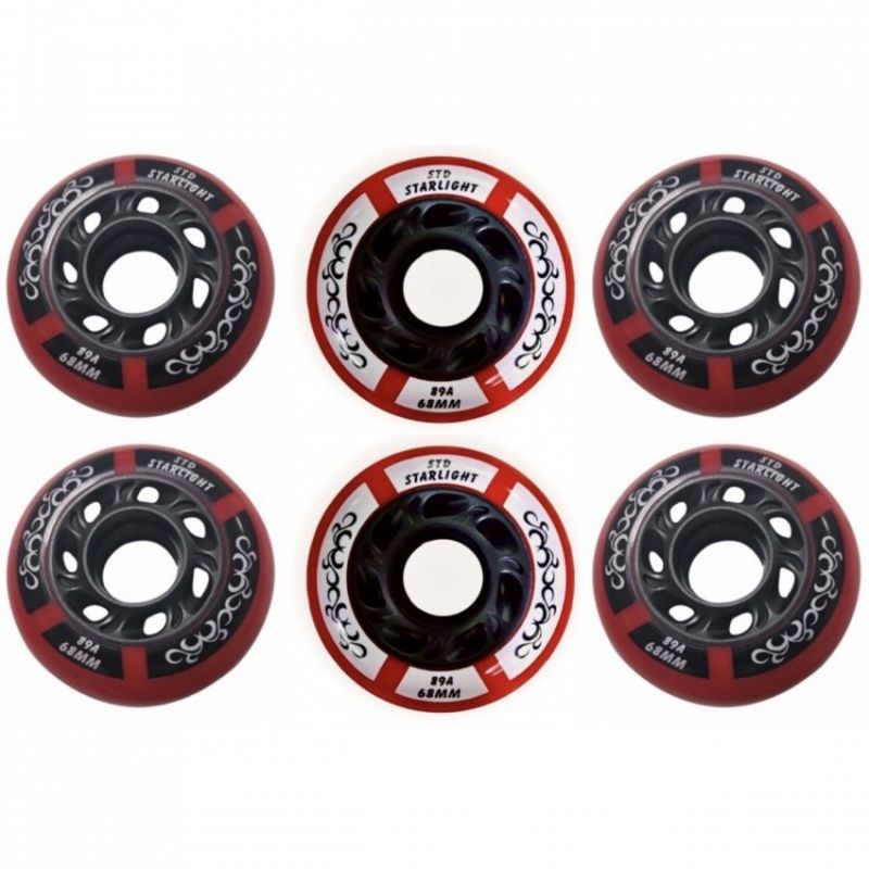 STD Starlight wheels are an excellent choice for figure skating enthusiasts, providing effective shock absorption, excellent rolling, and abrasion resistance. Key features: Effective shock absorption: STD Starlight wheels are designed to effectively absorb shock while skating, resulting in comfort and reduced joint pressure. Smooth rolling: Thanks to high-quality materials and precise workmanship, the wheels ensure smooth rolling, enabling stable and controlled figure skating. Abrasion resistance: Made of polyurethane (PU), STD Starlight wheels offer good abrasion resistance even on hard surfaces such as asphalt. In short, STD Starlight wheels not only guarantee effective shock absorption and smooth rolling, but also durability and resistance to wear and tear. Thanks to them, figure skating becomes even more enjoyable and safe. TECHNICAL PARAMETERS Intended use Figure skating Size 68 mm Hardness 4x84A, 2x89A Bearings None Quantity Set: 6 pcs