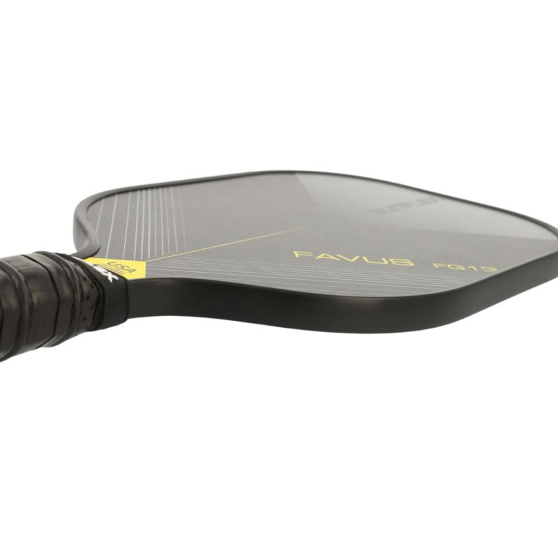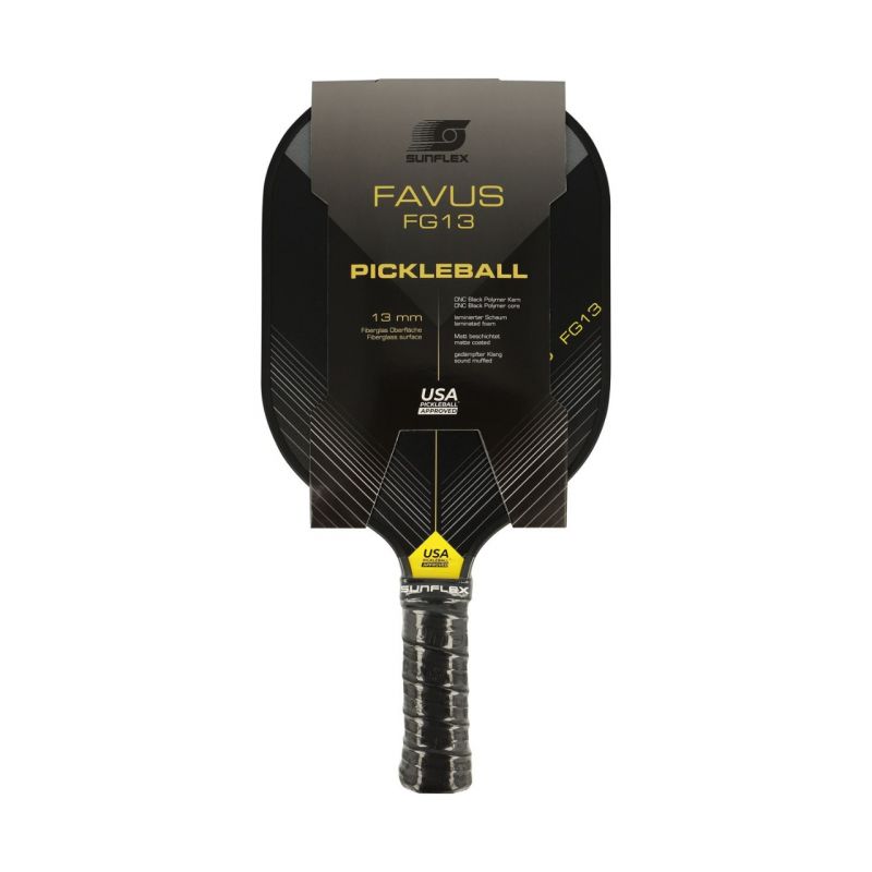 The Sunflex Favus 53520 Pickleball Racket is recommended for intermediate players. The head of the racket is covered with fiberglass to reduce drag and increase swing speed. Foam injected into the perimeter of the racket increases weight and stability, raising the sweet spot for consistent performance from edge to edge. The polymer honeycomb structure (CNC Black Polymer) inside the racket helps maximize striking accuracy and the feel required for every shot. The foam-filled grip maximizes cushioning, providing greater mobility and comfort. The perforated, non-slip grip fits securely in the hand for added cushioning. Ideal for two-handed hitting. Technical data: · Racket length: 40 cm · Racket width: 20 cm · Handle length: 13 cm · Handle circumference: 10 cm · Speed: 85 · Spin: 80 · Control: 80 · Weight: 226 g