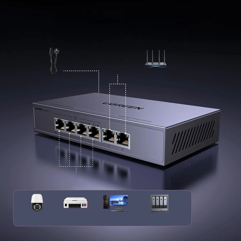 The Ugreen CM753 is a robust and efficient 6-port Ethernet switch with PoE+ support, designed for home and business networks requiring stability and high throughput. Five 1Gbps ports and four PoE+ ports enable simultaneous power and data transfer to IP cameras, Wi-Fi access points, and surveillance devices. Its metal casing, 6KV surge protection, and three operating modes make it an ideal choice for demanding users.