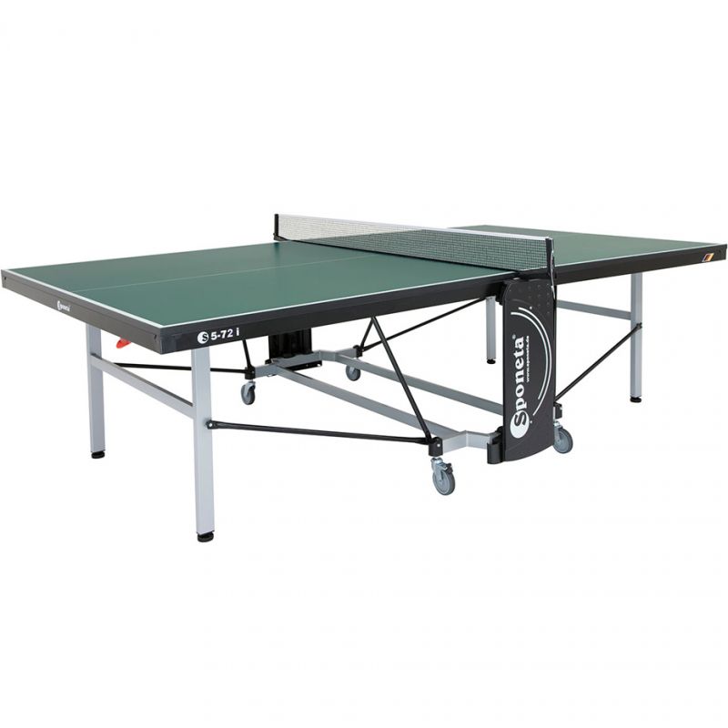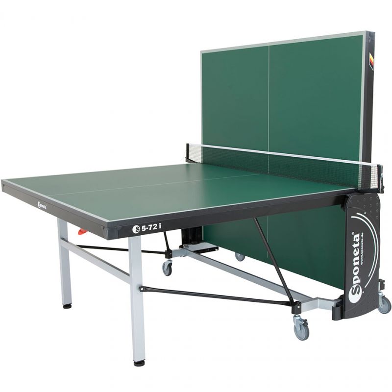 SPONETA S5-72i TABLE TENNIS TABLE, Green 136850. This table tennis table is from the renowned German company Sponeta. Convenient wheels allow for easy transport. In accordance with the EU standard EN-14468-1, the table is safe for children; the distance between the folded tabletops does not pose a risk of entrapment. Technical data: tabletop – 22mm chipboard, 50mm profile mesh – Perfekt-II-EN stationary with height adjustment locking system – SMS (Smart Manual System) leg attachment system – Compact / legs 50 x 30 mm wheels – 4 – ø 100 mm including 2 swivel, rubber tread dimensions – folded: L = 164cm x W = 72cm x H = 156cm, Ready to play: L = 274cm x W = 187cm x H = 76cm packaging – H = 158cm x L = 142cm x B = 16cm weight – net 91kg, gross 96.5kg Transport cost: PLN 155 gross FREE delivery within the Tricity area