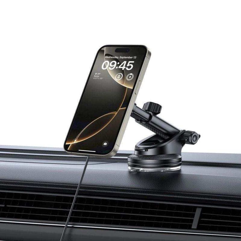 The holder's key feature is its use of magnets, which adhere perfectly to MagSafe-enabled phones. This ensures a strong and secure hold without the need for traditional magnetic plates. A built-in 15W wireless charger allows for fast phone charging while driving, eliminating the need for additional cables. A variety of mounting options allows the holder to be conveniently placed within the driver's reach without taking up valuable space.