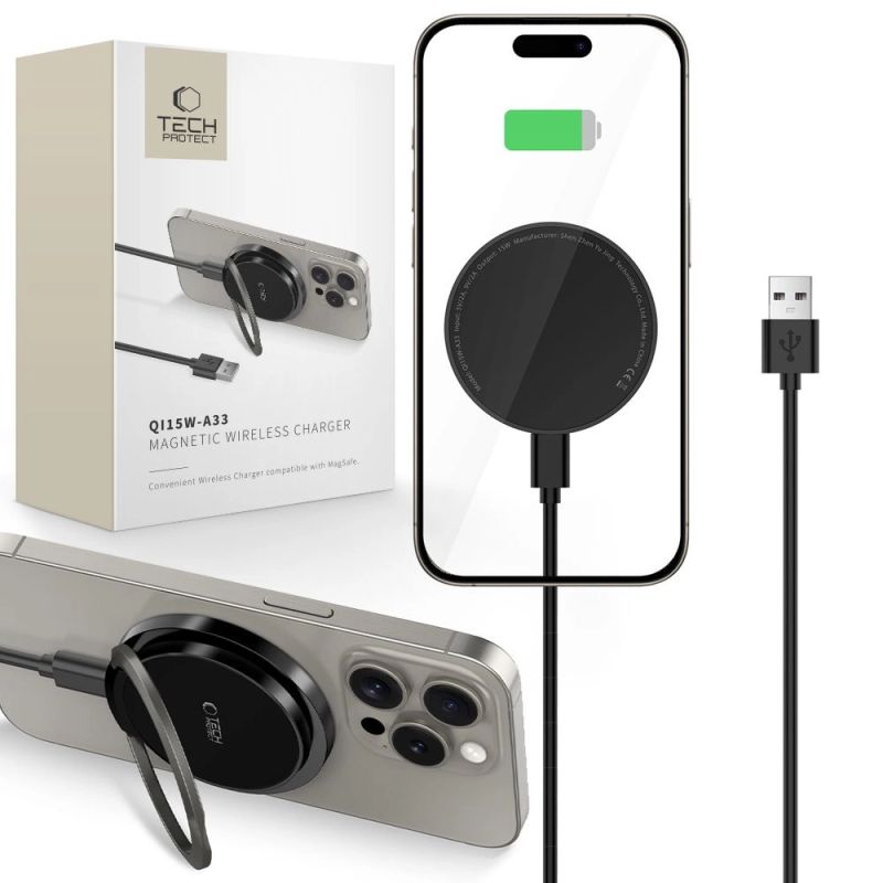 Tech-Protect QI15W-A33 Inductive Charger with MagSafe and Stand with USB-A / USB-C Cable - Black